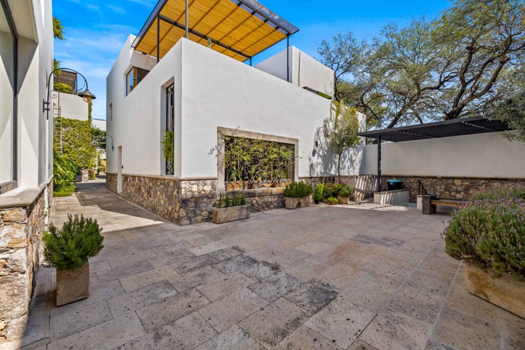 At the high end of the market, homes share certain traits. Many include internal courtyards that bring light and air into the center of the house, often with fountains, trees, or sculptural planting. Rooftop terraces are common and may feature outdoor kitchens, plunge pools, fireplaces, or pergolas that frame views of the Parroquia and the hills. Stone and wood finishes, custom ironwork, and solid doors give a sense of permanence and craft.