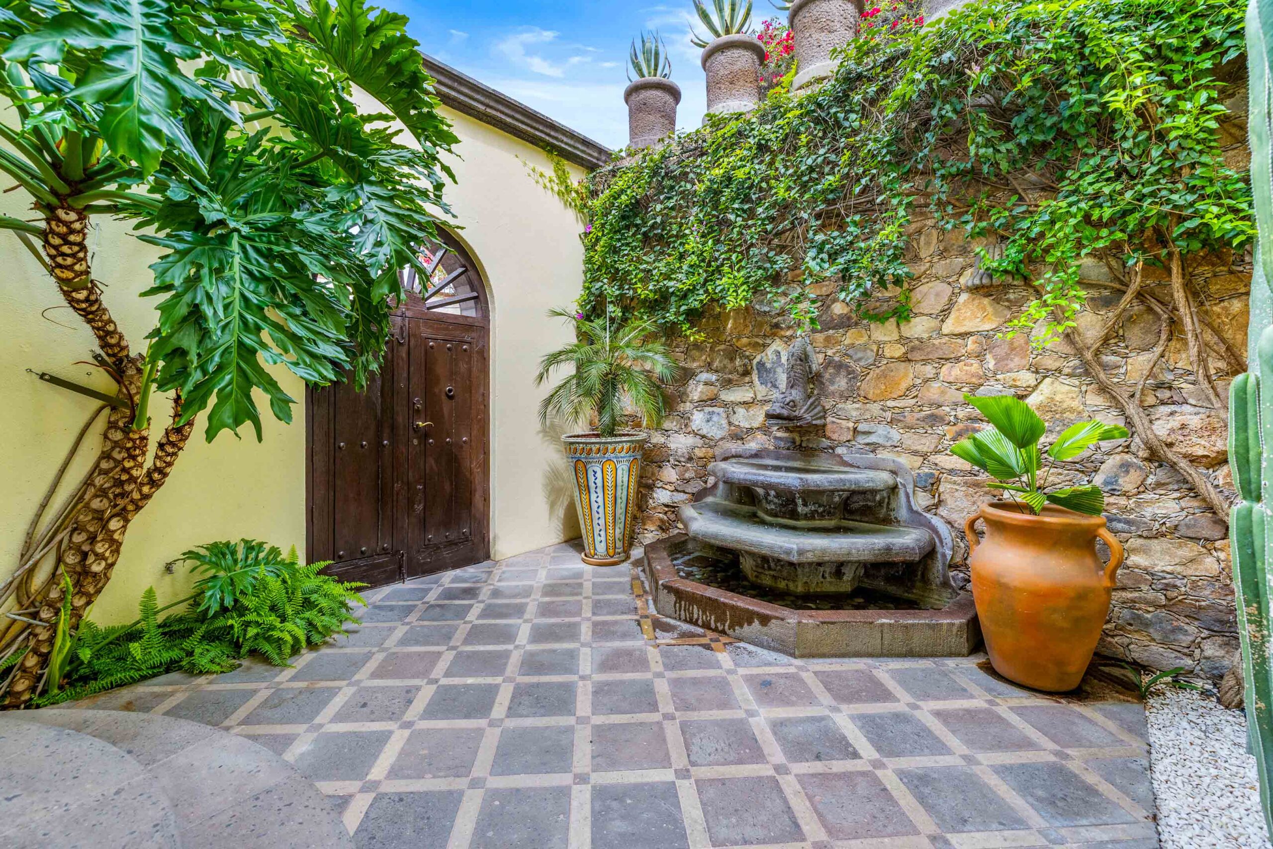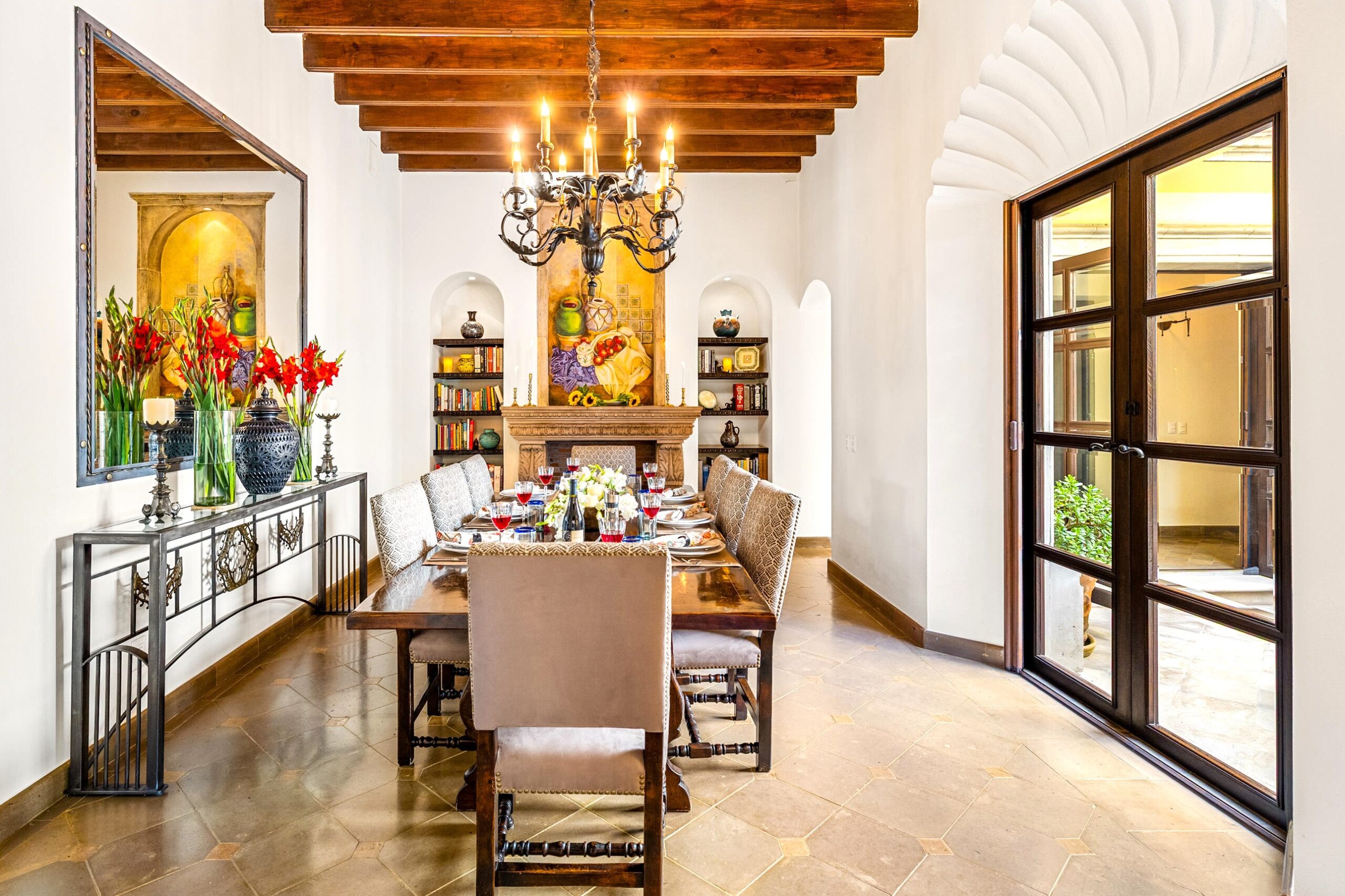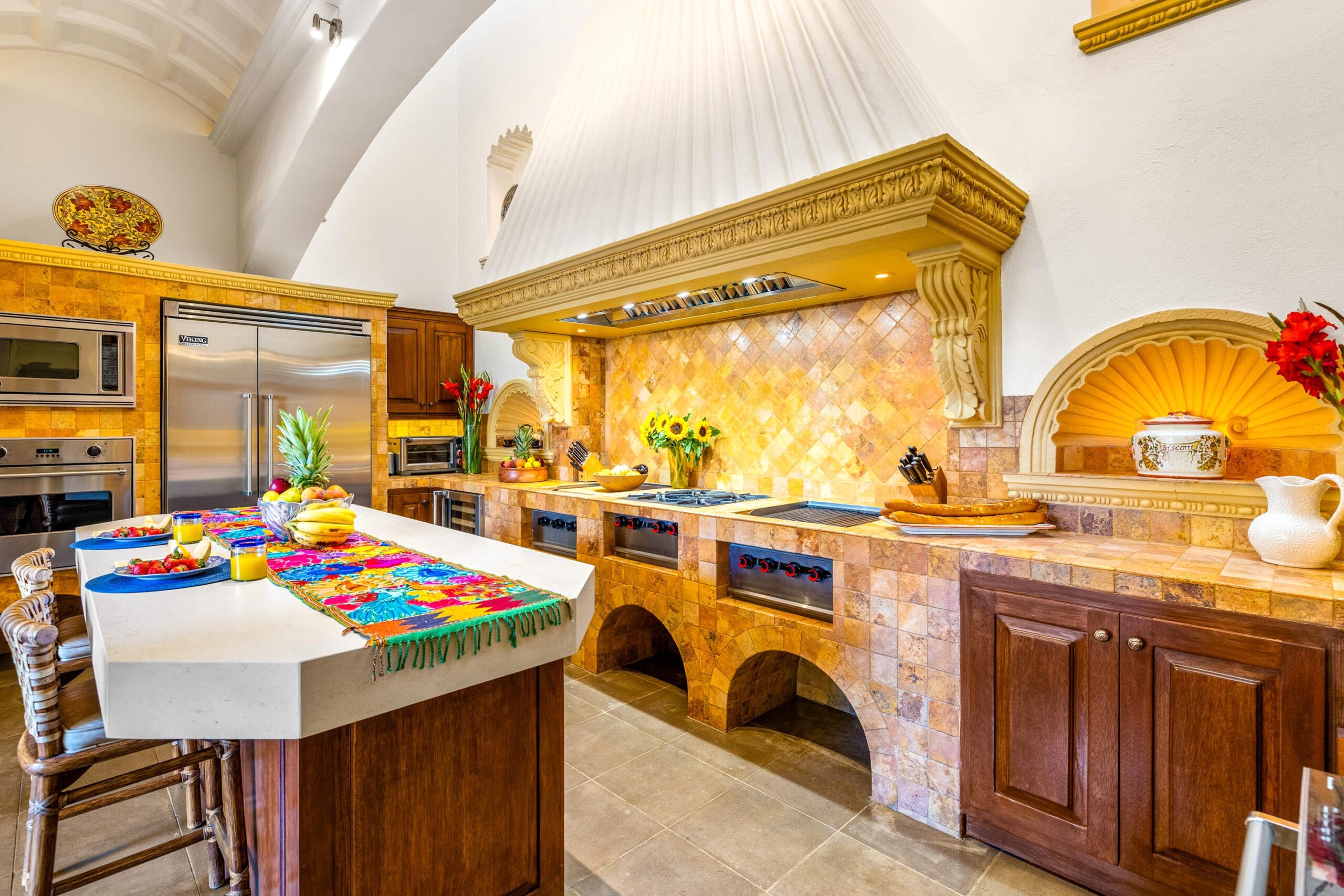 Casa Nostra Familia boasts the finest of finishes throughout: cantera stone flooring, beamed and stenciled-tile ceilings, boveda ceilings, custom wood doors with beveled glass windows, Jali-screen carvings over several windows, custom brass and cantera sinks, vanishing screens throughout, seven ornate carved cantera fireplaces, custom hardware…nothing was overlooked, nothing missed an update. A grand dauphine fountain anchors the entry courtyard before guests arrive at a formal foyer, radiating into the enormous living room. The formal dining room can easily seat 10 for dinner with built-ins flanking a massive cantera fireplace, while the adjacent kitchen clearly reflects the whims of a professional chef: Viking appliances including a caterer-size refrigerator, convection oven, triple-component range—burners, gridle and grill—under a massive commercial-grade range hood, large walk-in pantry, enormous 5-stool island, and wine refrigerator, all spilling into the adjacent outdoor fireplace-anchored and cantera basketweave-columned cocktail terrace that spans between the indoor dining and the outdoor dining room with powder bath.