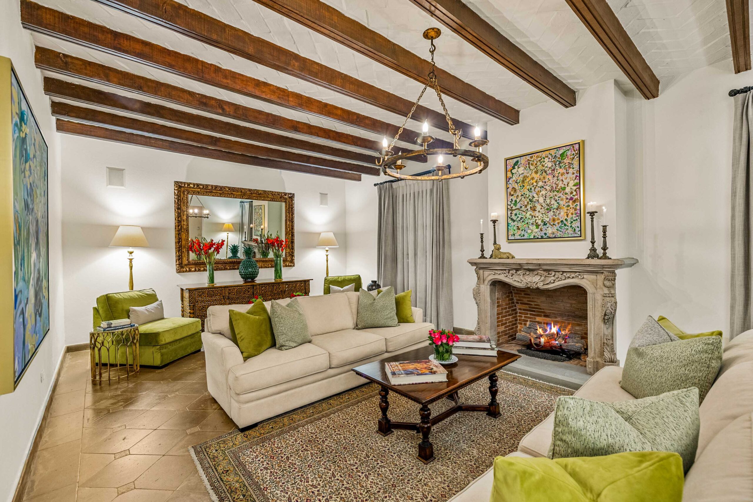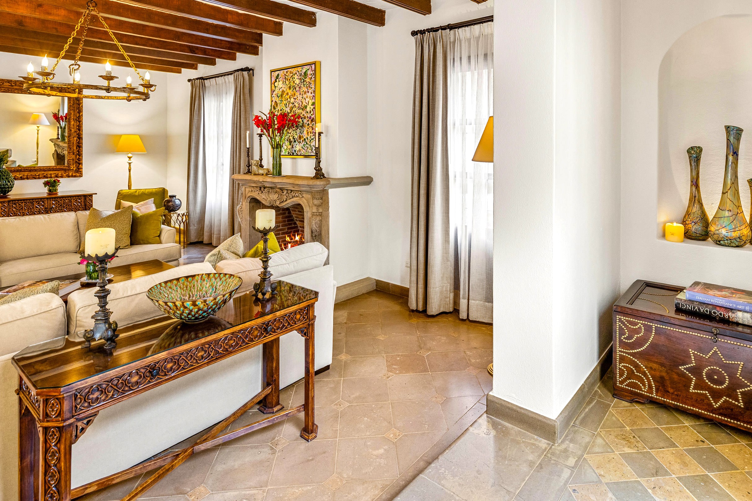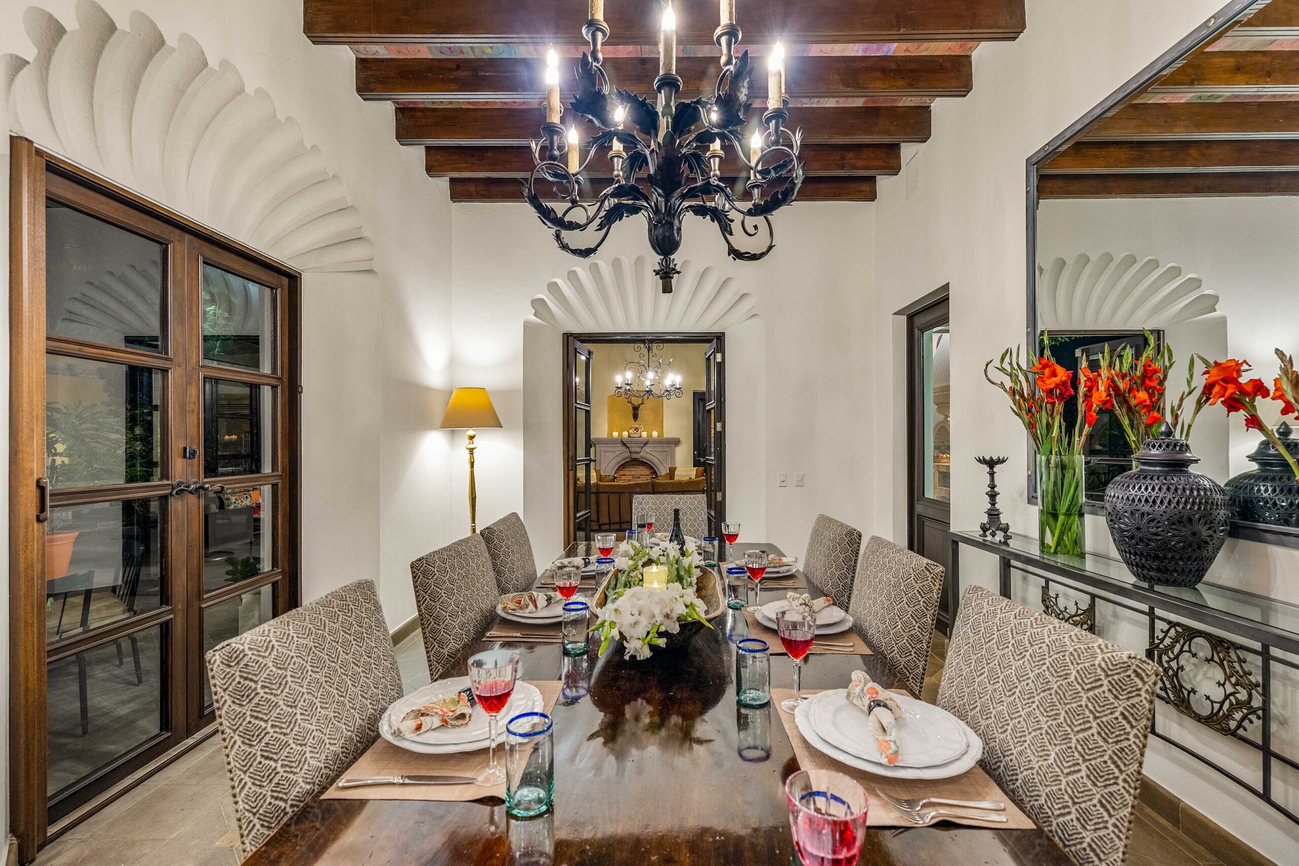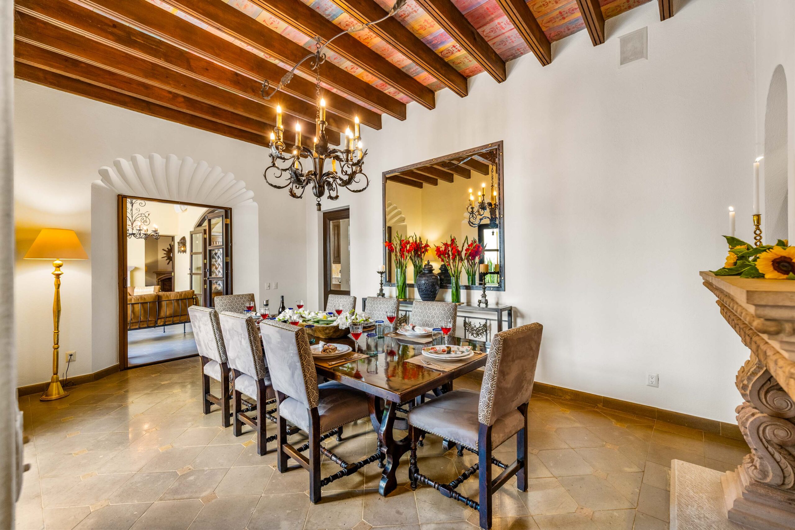 Casa Nostra Familia boasts the finest of finishes throughout: cantera stone flooring, beamed and stenciled-tile ceilings, boveda ceilings, custom wood doors with beveled glass windows, Jali-screen carvings over several windows, custom brass and cantera sinks, vanishing screens throughout, seven ornate carved cantera fireplaces, custom hardware…nothing was overlooked, nothing missed an update. A grand dauphine fountain anchors the entry courtyard before guests arrive at a formal foyer, radiating into the enormous living room. The formal dining room can easily seat 10 for dinner with built-ins flanking a massive cantera fireplace, while the adjacent kitchen clearly reflects the whims of a professional chef: Viking appliances including a caterer-size refrigerator, convection oven, triple-component range—burners, gridle and grill—under a massive commercial-grade range hood, large walk-in pantry, enormous 5-stool island, and wine refrigerator, all spilling into the adjacent outdoor fireplace-anchored and cantera basketweave-columned cocktail terrace that spans between the indoor dining and the outdoor dining room with powder bath.