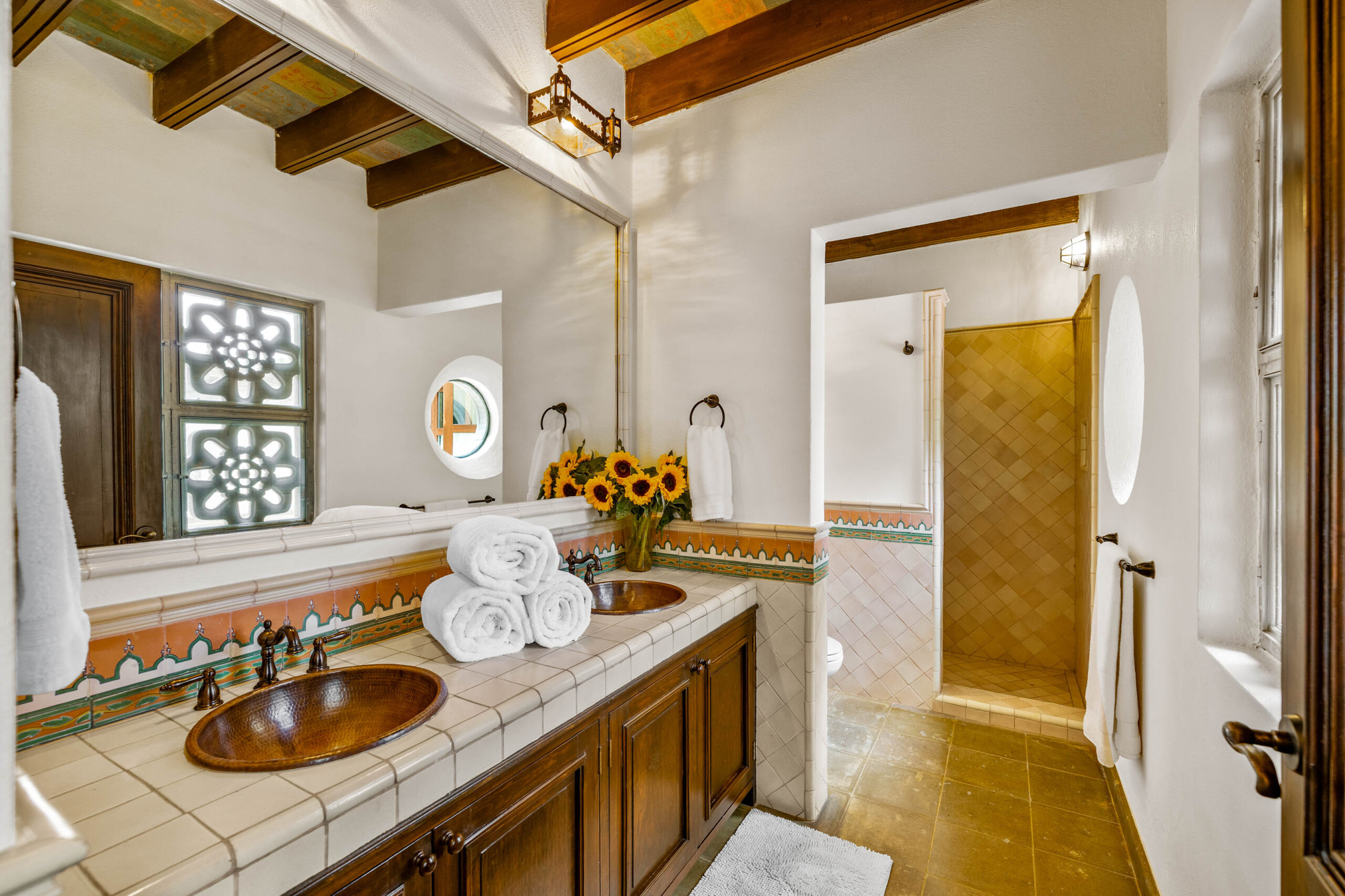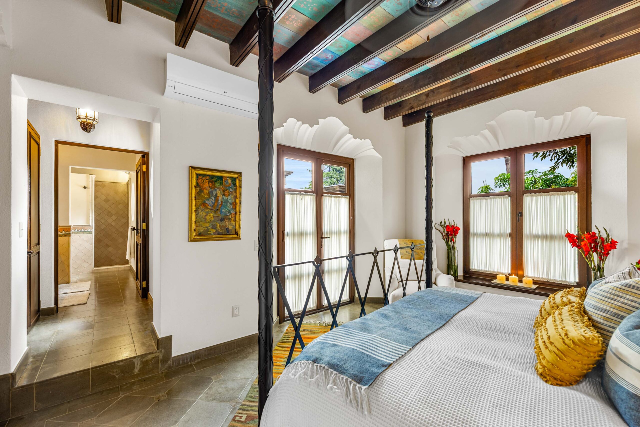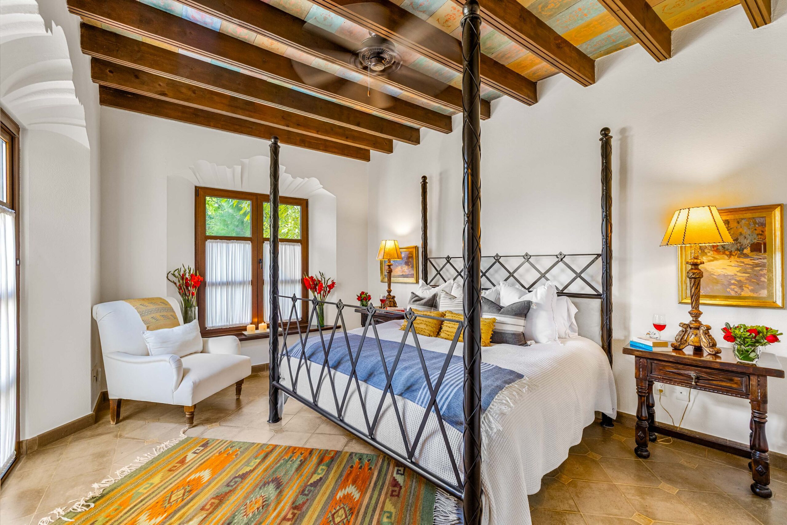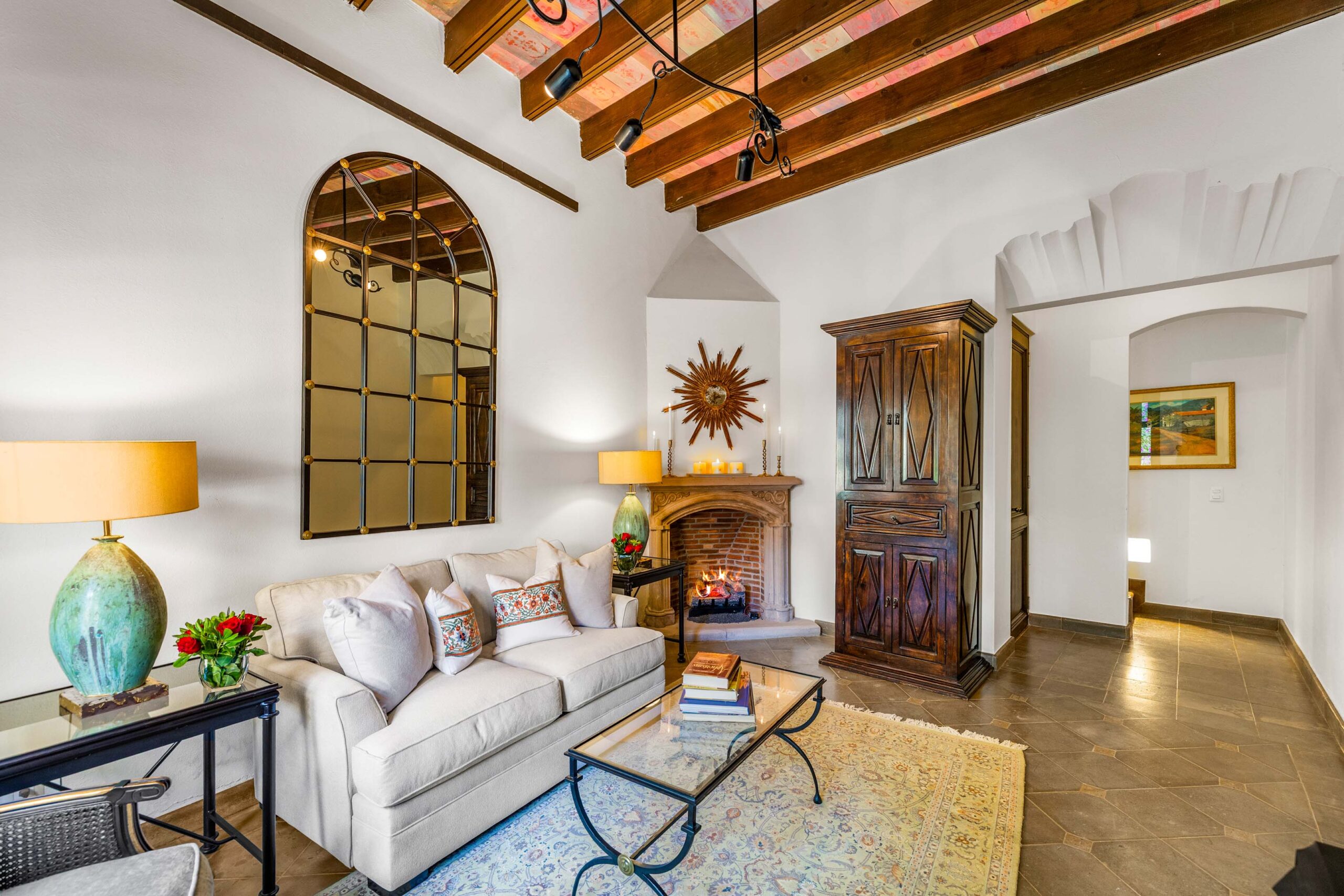 The heavily landscaped and fountain-anchored ground floor terrace—plentiful enough to add a lap or plunge pool—boasts a shaded living room configuration, but the roof terrace also offers a third dining area and covered seating collection with wet bar boasting city-wide views. While the home provides a ground-floor bedroom—currently used as a library—three bedrooms populate the 2nd floor—as does the 5th separate-wing casita bedroom—with two equal-sized primary suites. The newest and current four-poster fireplace-anchored primary suite boasts new Kommerling dual-paned doors and windows, a large outdoor cantera-balustrade terrace and a bathroom straight from Architectural Digest: massive marble dual-sink vanity, jetted tub with a designer nicho surround, frosted-glass shower and toilet stall, and multiple clamshell nichos, all topped by a cast-coffered canyon ceiling with skylights. The enchanting 2-story casita offers a fireplace living room downstairs, and a large king-bed with dual-sink bathroom upstairs.