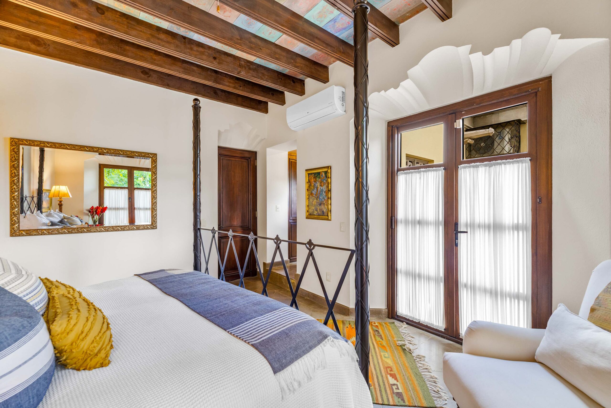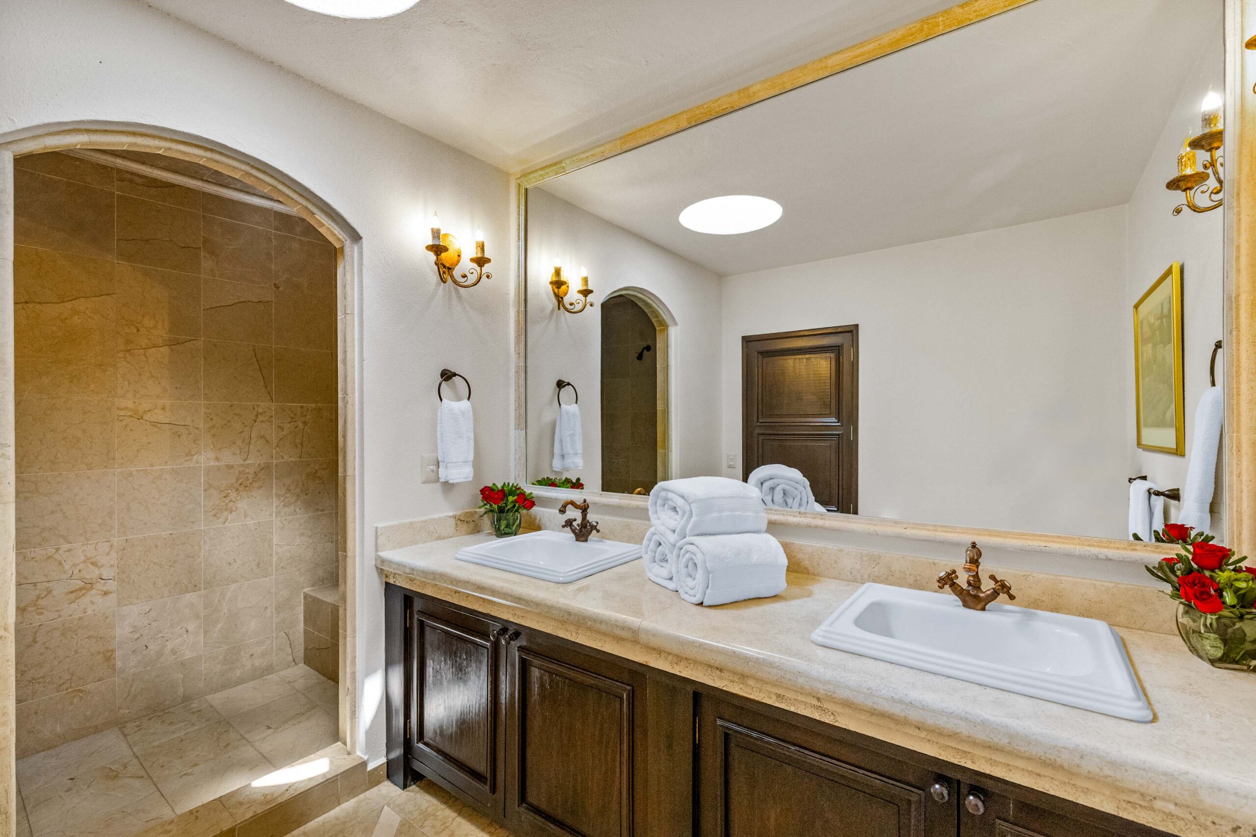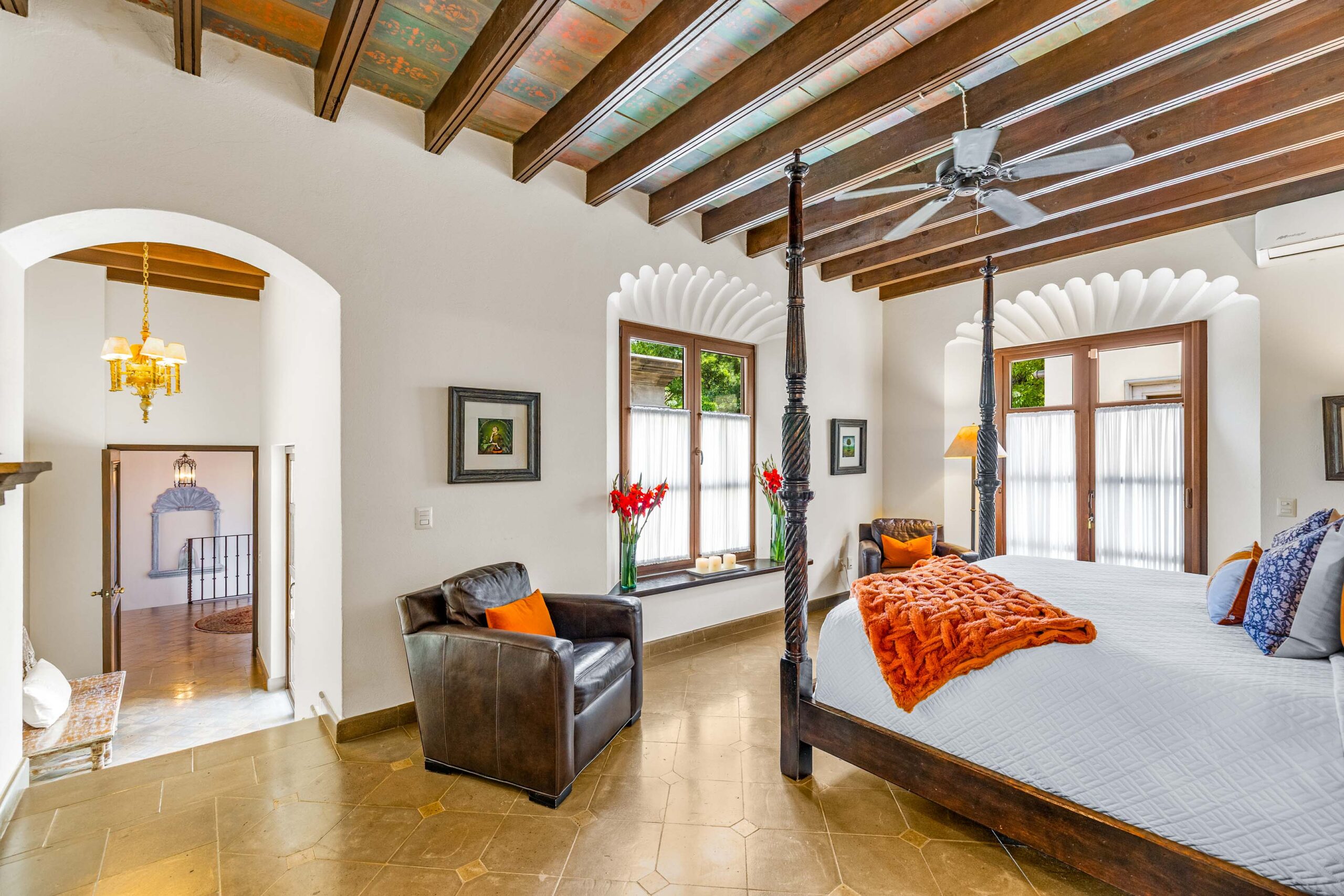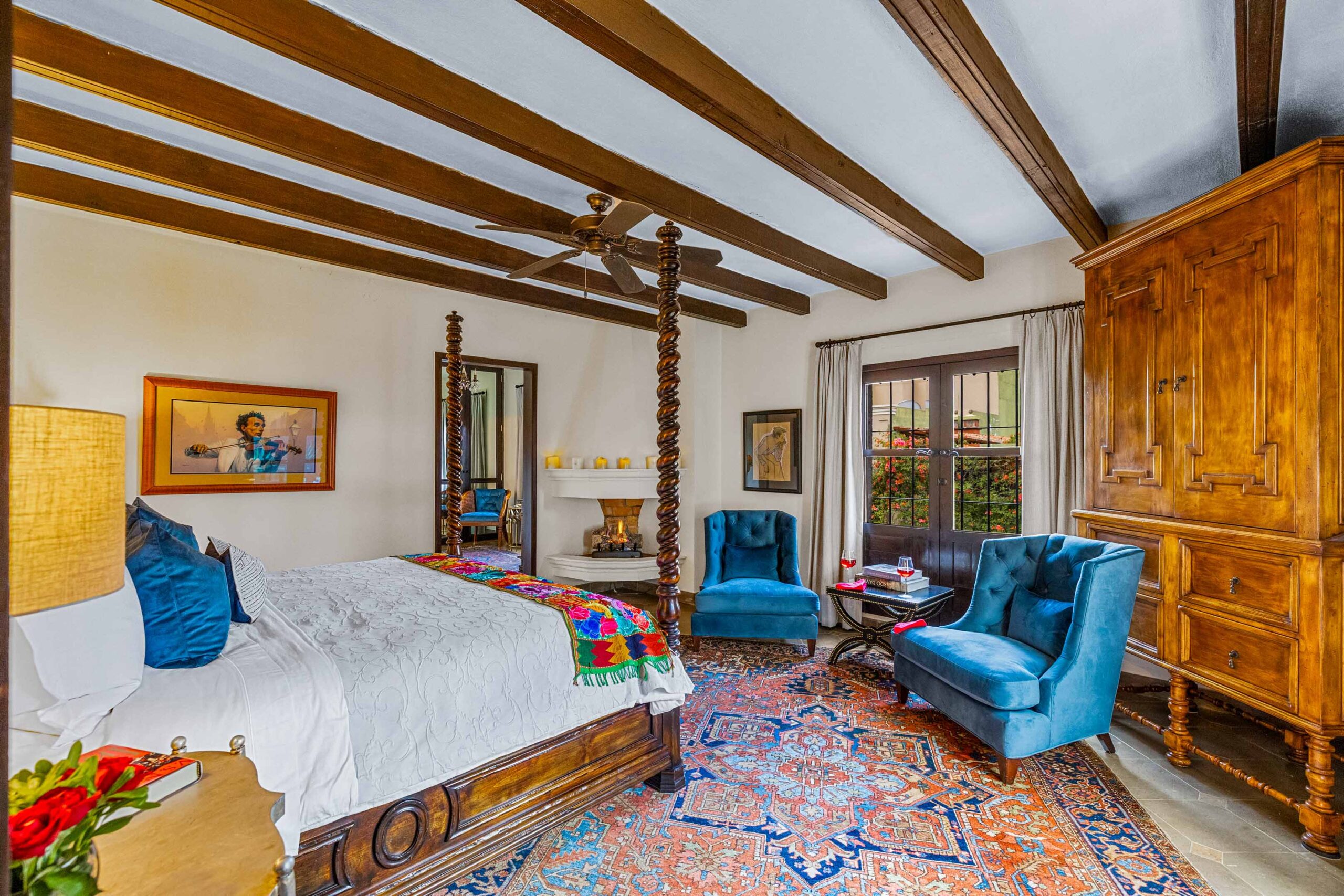 The heavily landscaped and fountain-anchored ground floor terrace—plentiful enough to add a lap or plunge pool—boasts a shaded living room configuration, but the roof terrace also offers a third dining area and covered seating collection with wet bar boasting city-wide views. While the home provides a ground-floor bedroom—currently used as a library—three bedrooms populate the 2nd floor—as does the 5th separate-wing casita bedroom—with two equal-sized primary suites. The newest and current four-poster fireplace-anchored primary suite boasts new Kommerling dual-paned doors and windows, a large outdoor cantera-balustrade terrace and a bathroom straight from Architectural Digest: massive marble dual-sink vanity, jetted tub with a designer nicho surround, frosted-glass shower and toilet stall, and multiple clamshell nichos, all topped by a cast-coffered canyon ceiling with skylights. The enchanting 2-story casita offers a fireplace living room downstairs, and a large king-bed with dual-sink bathroom upstairs.