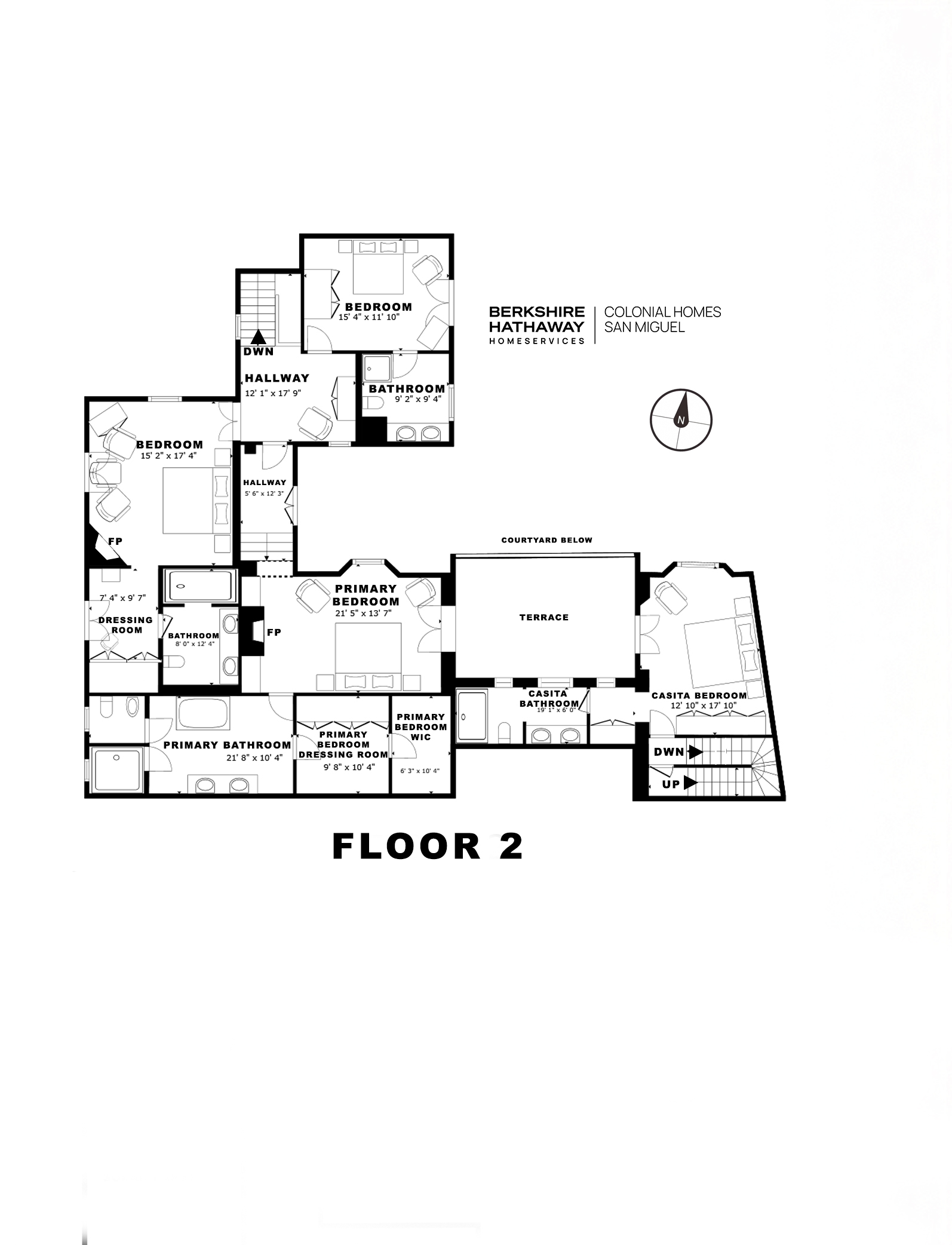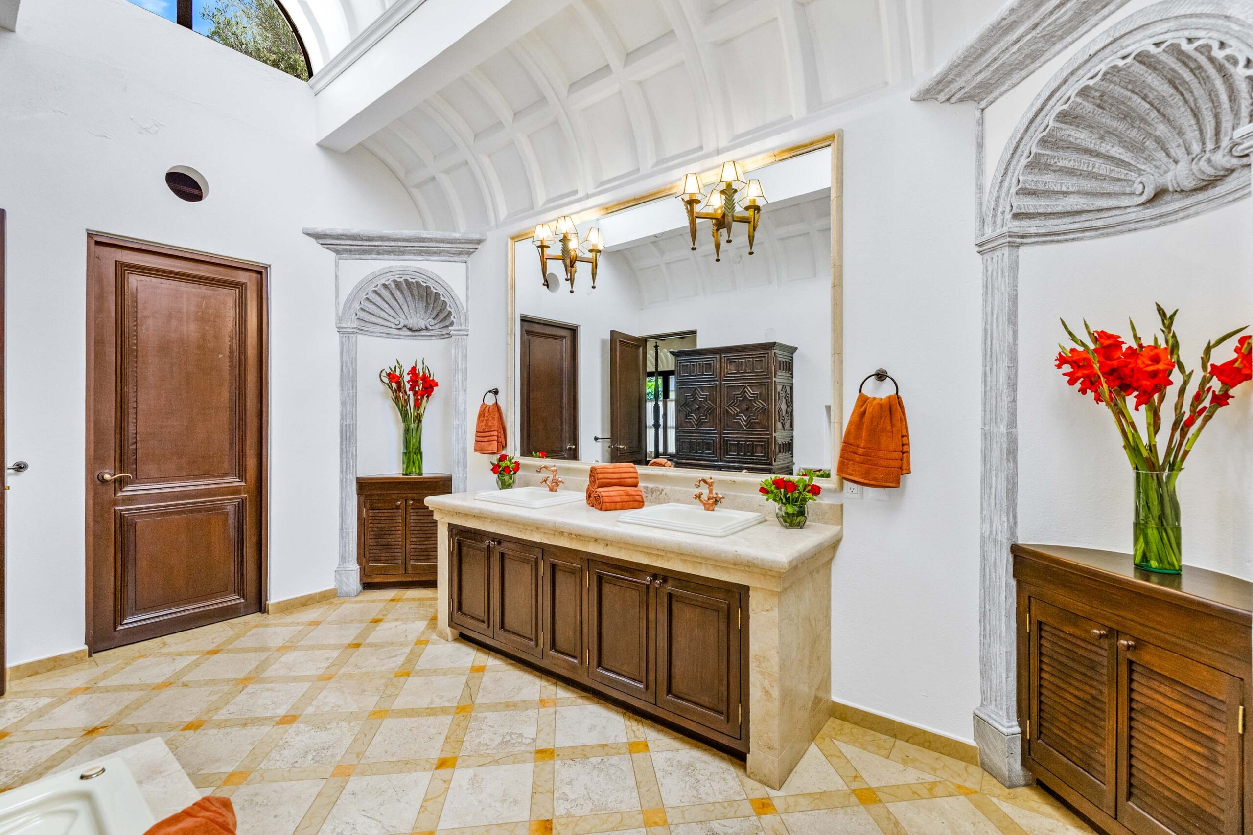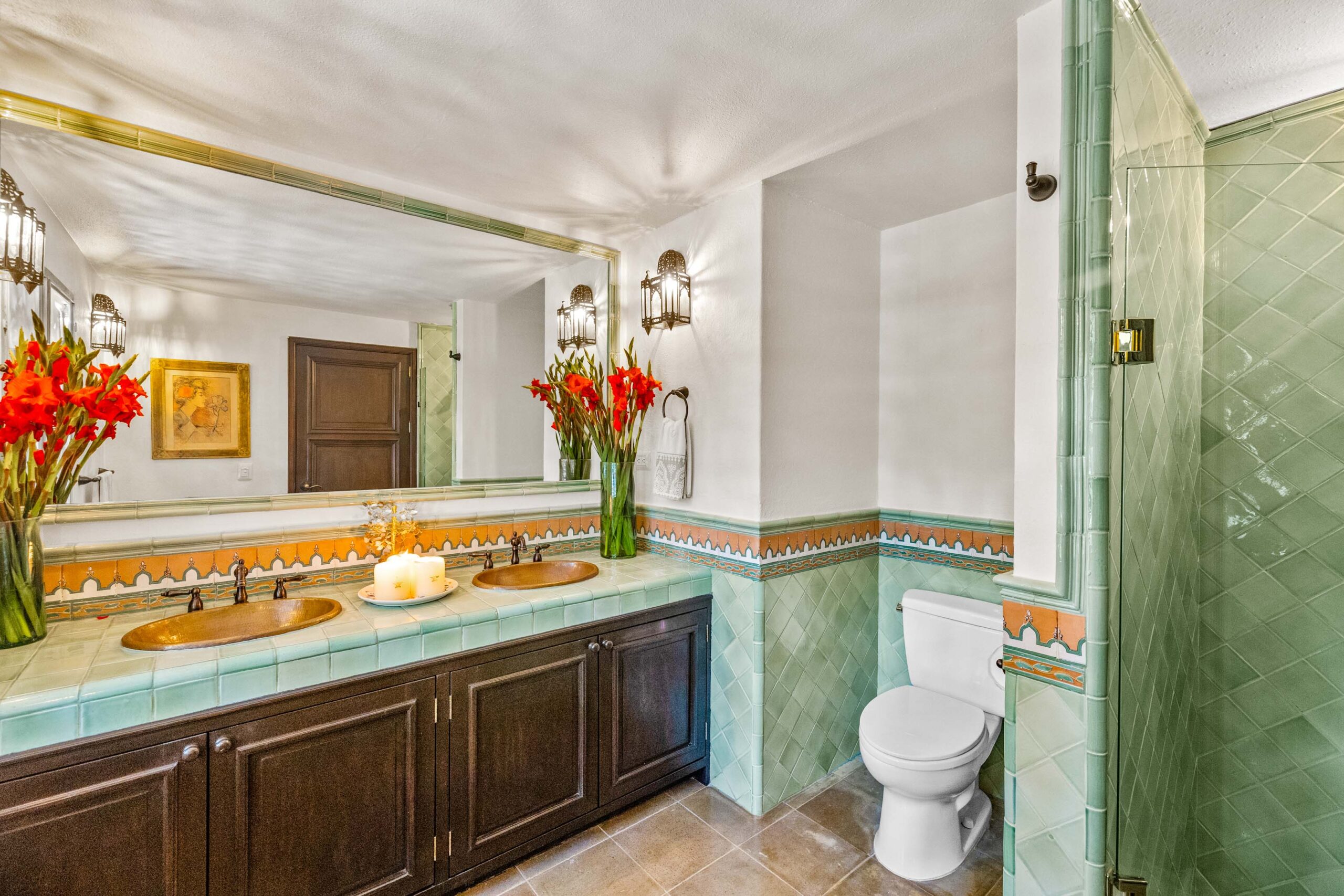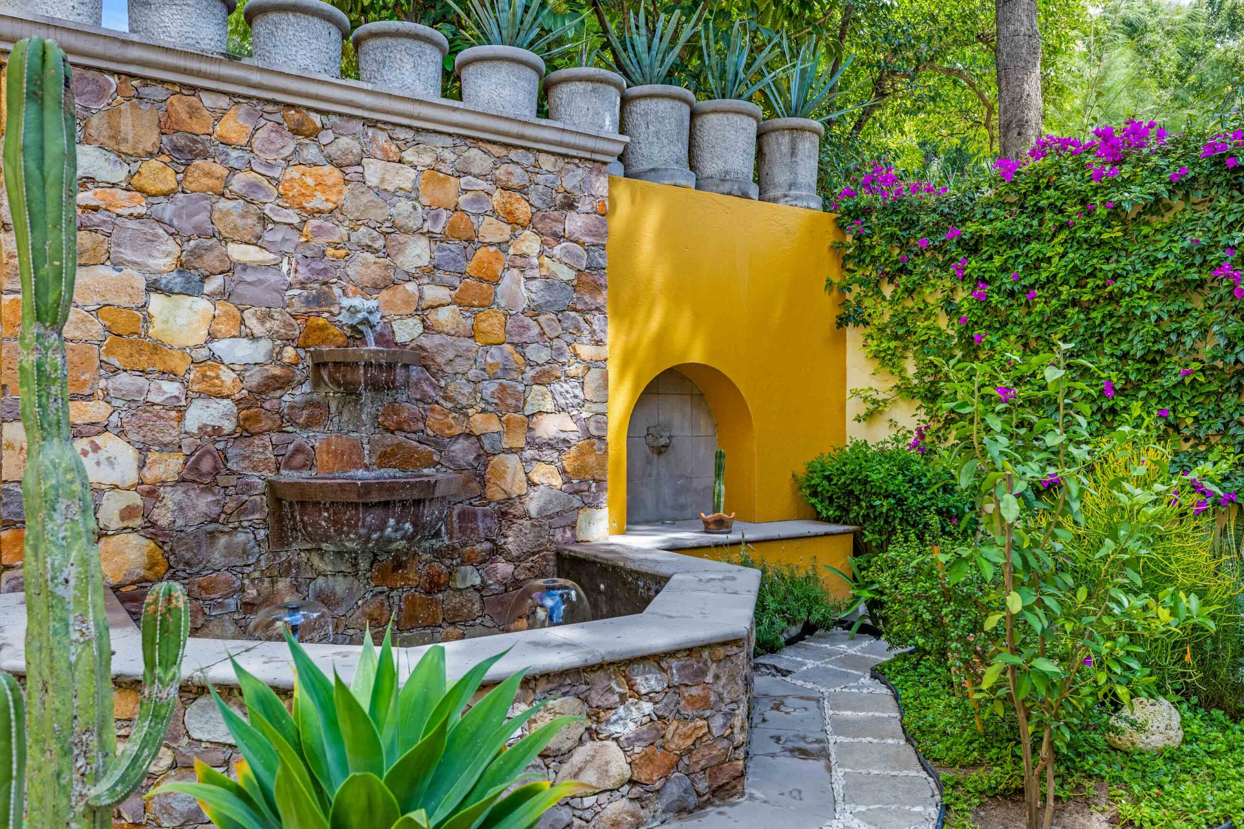 The heavily landscaped and fountain-anchored ground floor terrace—plentiful enough to add a lap or plunge pool—boasts a shaded living room configuration, but the roof terrace also offers a third dining area and covered seating collection with wet bar boasting city-wide views. While the home provides a ground-floor bedroom—currently used as a library—three bedrooms populate the 2nd floor—as does the 5th separate-wing casita bedroom—with two equal-sized primary suites. The newest and current four-poster fireplace-anchored primary suite boasts new Kommerling dual-paned doors and windows, a large outdoor cantera-balustrade terrace and a bathroom straight from Architectural Digest: massive marble dual-sink vanity, jetted tub with a designer nicho surround, frosted-glass shower and toilet stall, and multiple clamshell nichos, all topped by a cast-coffered canyon ceiling with skylights. The enchanting 2-story casita offers a fireplace living room downstairs, and a large king-bed with dual-sink bathroom upstairs.
