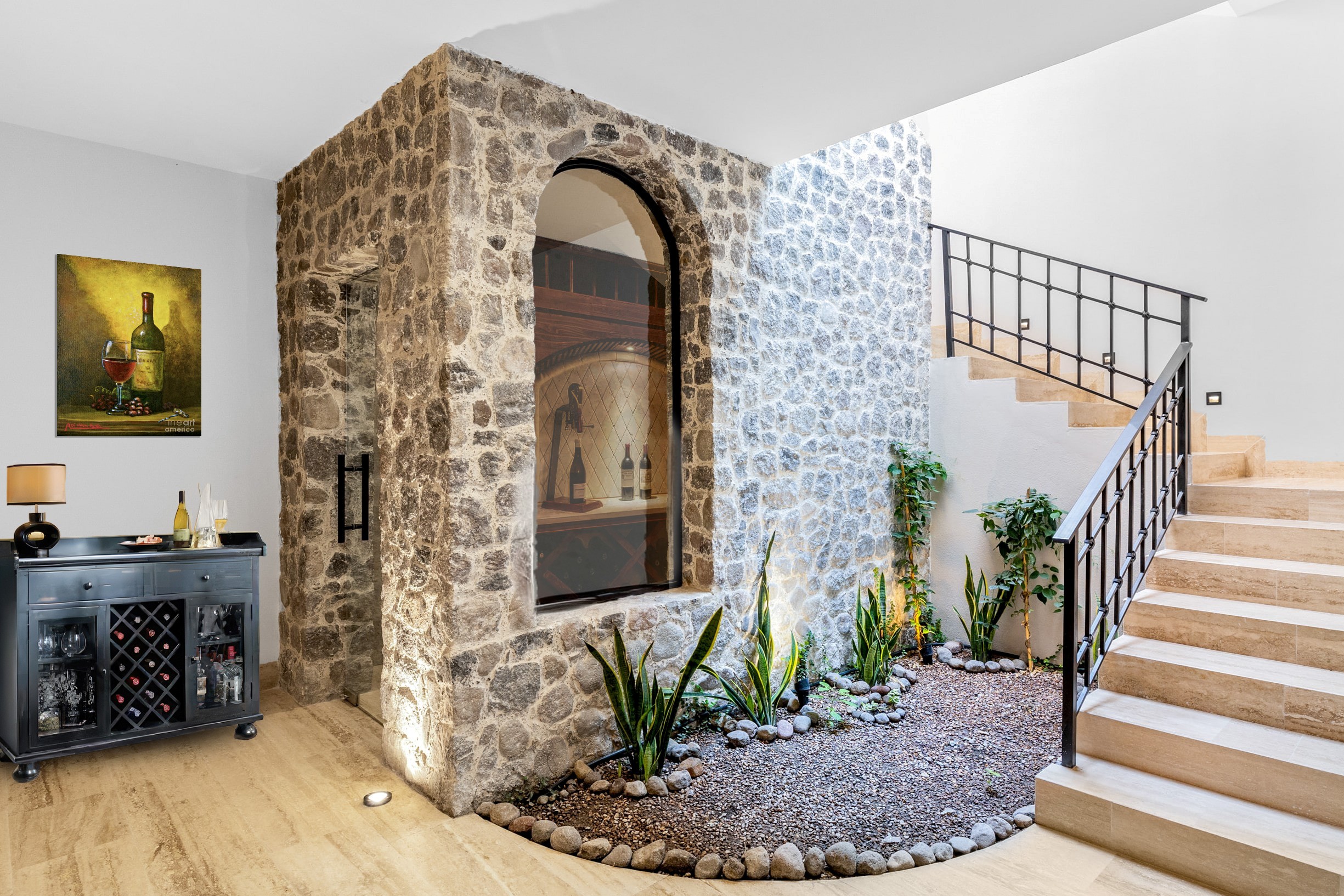 Upon entry into a grand garden and stone-wall entry foyer, Casa Ronda offers a ground-floor bedroom, but with an elevator chase incorporated into the plan. The glassed-in wine cellar makes a grand presentation upon entry as a focal point of the foyer, as does the upgraded plank-style jalapa marble flooring throughout the home! Upstairs hosts one-level living where the custom kitchen—details include a custom decorative-rivet hood and granite sink—offers a huge island for five barstools, extensive oak cabinetry—all ceiling-height doors and cabinets throughout the home are oak, a rarity in San Miguel—and large walk-in pantry, opening to both the central courtyard and adjacent dining, which flows to the fireplace-anchored living area with two-story south-facing windows and sliding doors. This level offers two guest bedrooms and boasts a high-ceiling massive master suite with terrace, oversized walk-in closet with shoe storage racks and vanity desk, marble-topped dual-sink vanity, and separate tub and shower. The central courtyard—which opens to the adjacent pocket park—offers both a lawn area and trellis-covered veranda pre-plumbed for an outdoor kitchen. Upstairs, the roof terrace offers a half-bath and is mostly trellis covered and also plumbed for a roof kitchen, all offering golf-course and lake views.