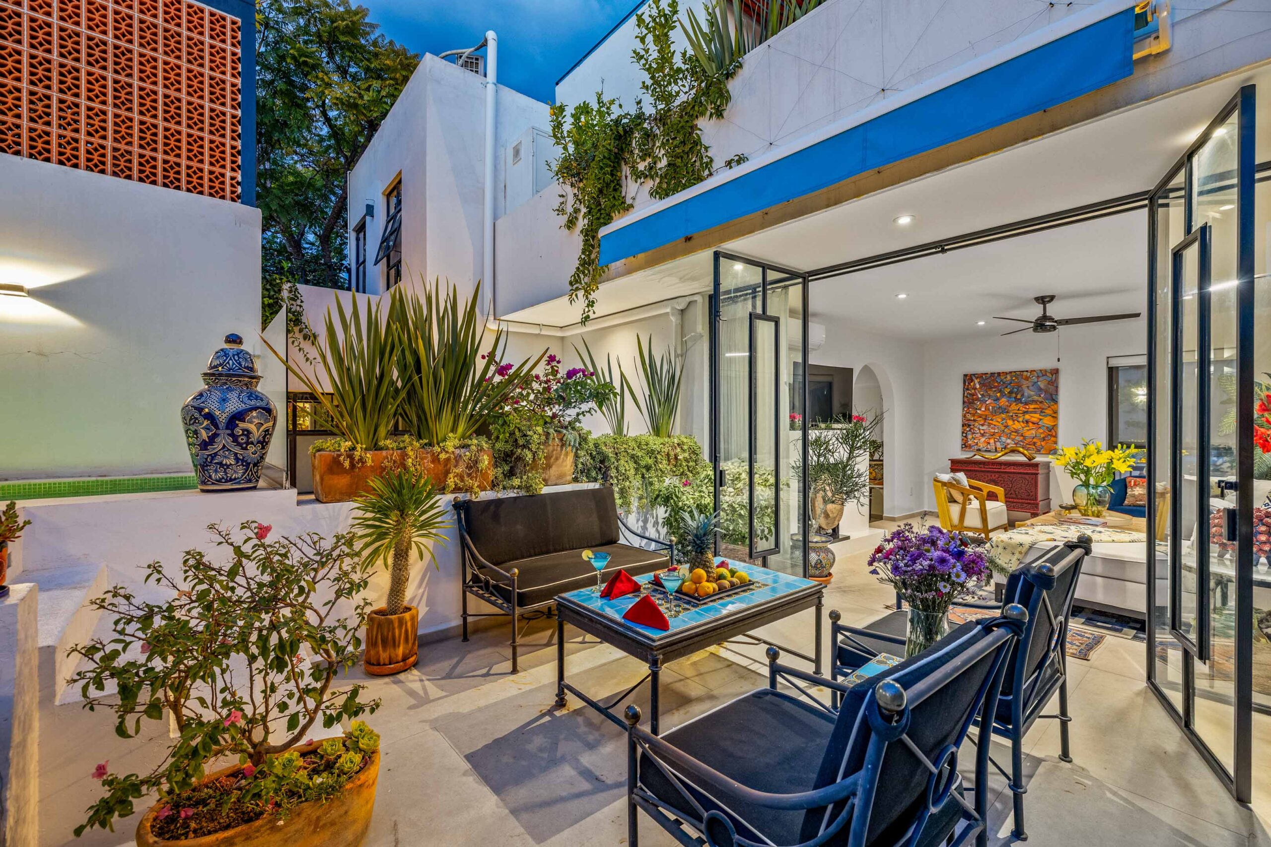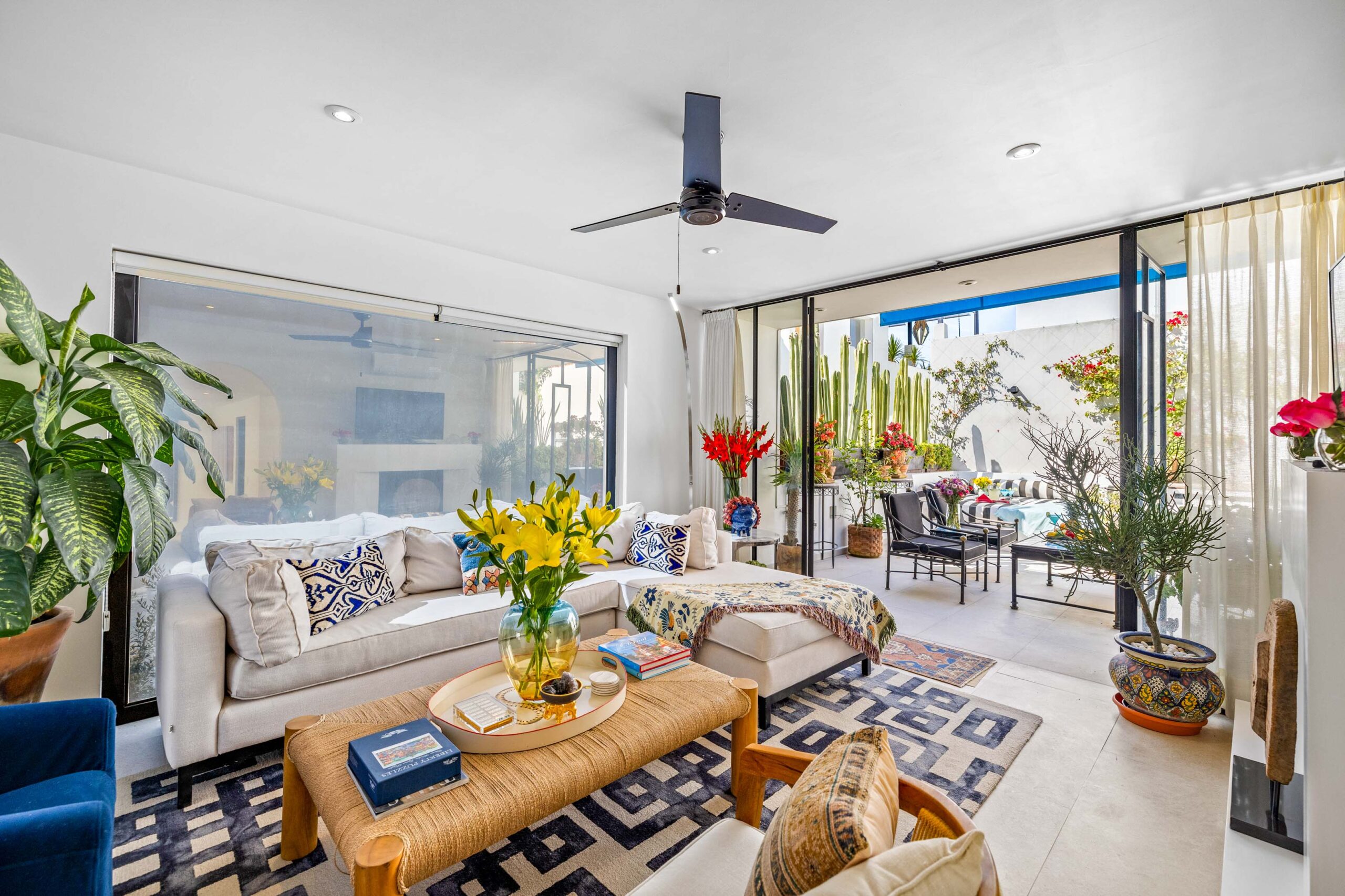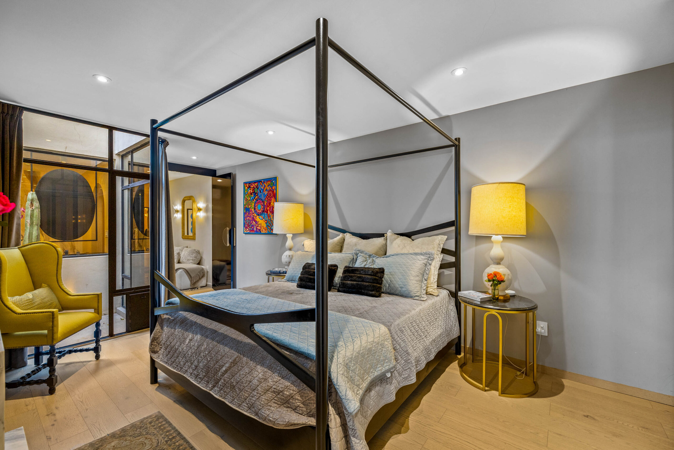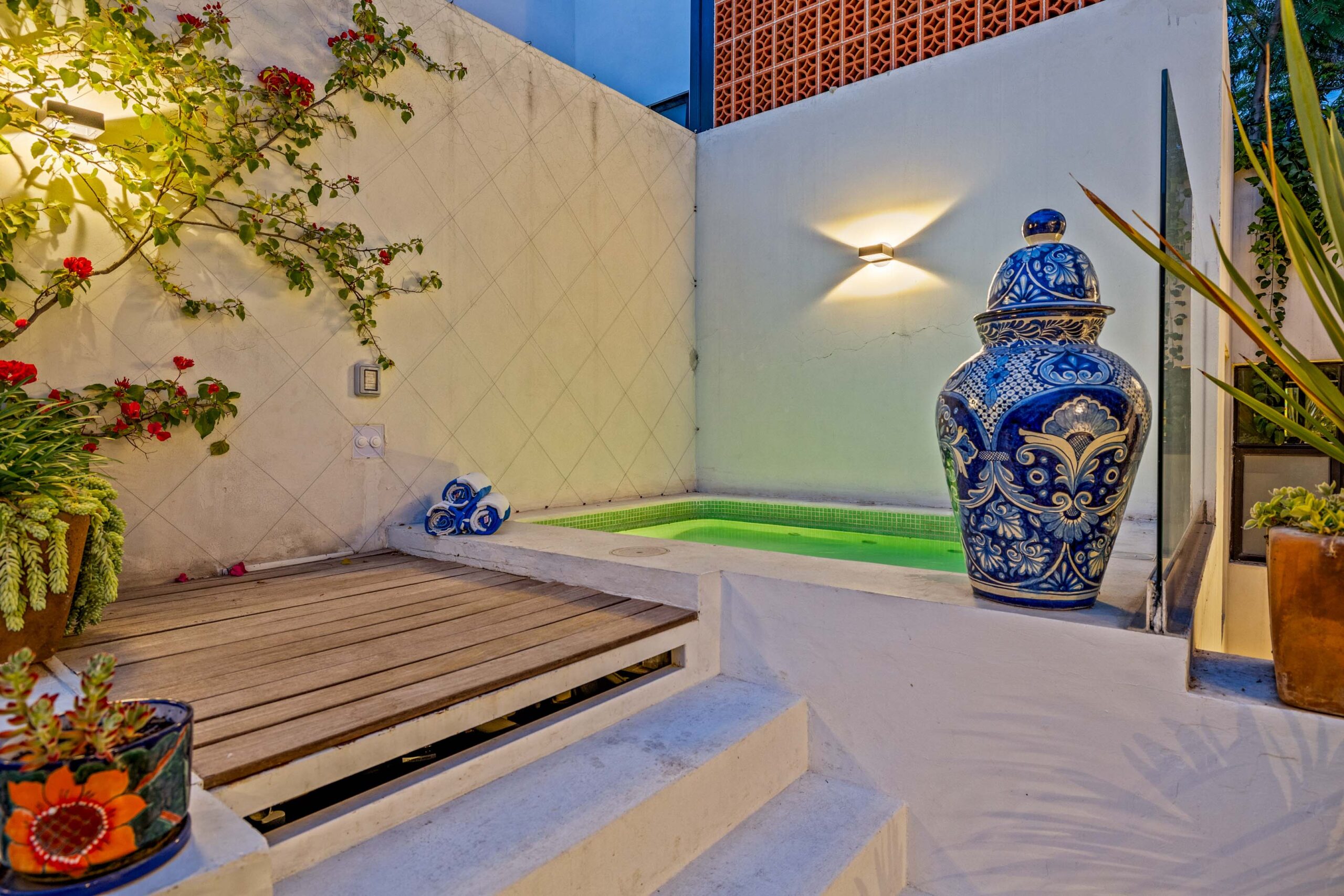This corner home with ideal south & east windows offers one-level living with a ground floor primary master suite, and the open-plan great room proves highly desirable with American clients. The master suite—replete with four-poster king-sized bed, two sets of closets, fireplace and terrace access—boasts a stunning marble-clad master bathroom with sitting area, oversized soaking tub, massive shower, and dual sinks, all naturally lit via windows opening to the courtyard. The 2nd floor offers a guest suite and amazing fireplace-anchored media/flex room opening through double French doors to the private spa terrace with hot tub, oversized resort-style chaise lounge, and cocktail sitting area. The 3rd floor guest suite offers a small coffee terrace and the roof terrace kitchen—wet bar, fridge and grill—hosts sunset dinner parties for six. Inclusive of underground gated parking and dual-entrance intercom gated security for the community, this home offers all the expected technical amenities including mini-splits in every room, water filtration system and two-story weeping-wall courtyard.