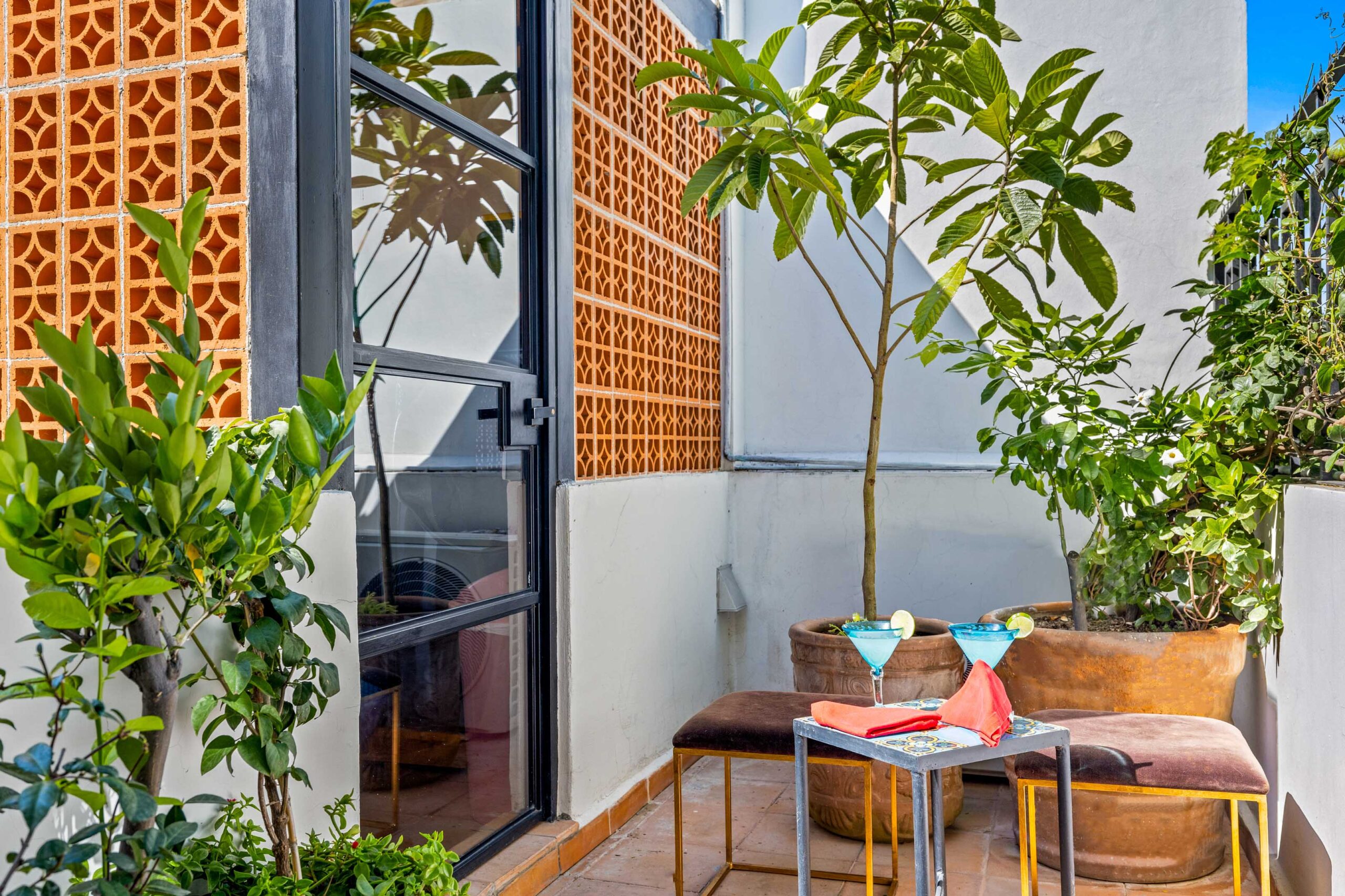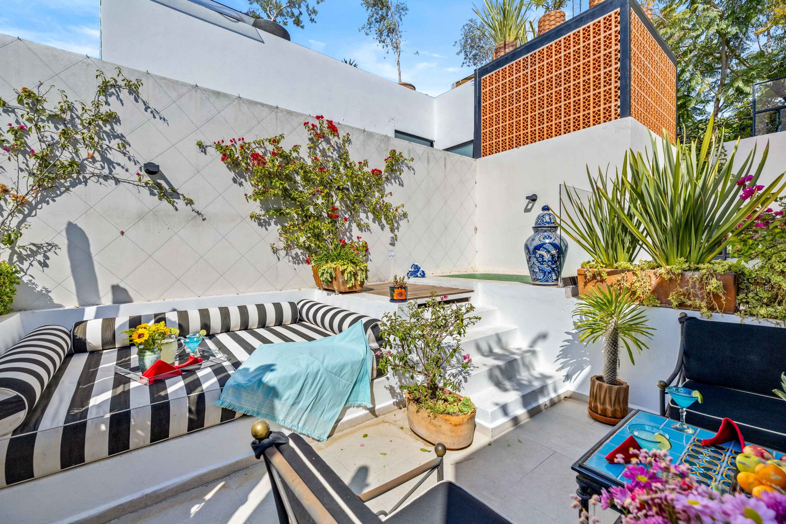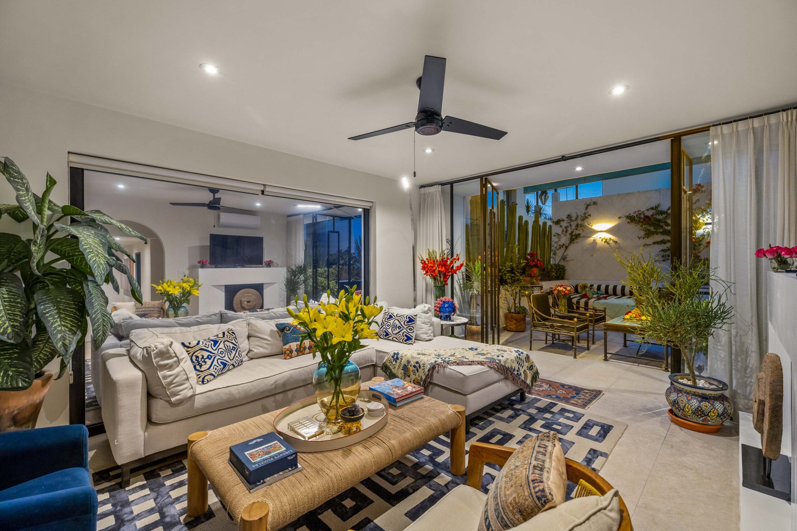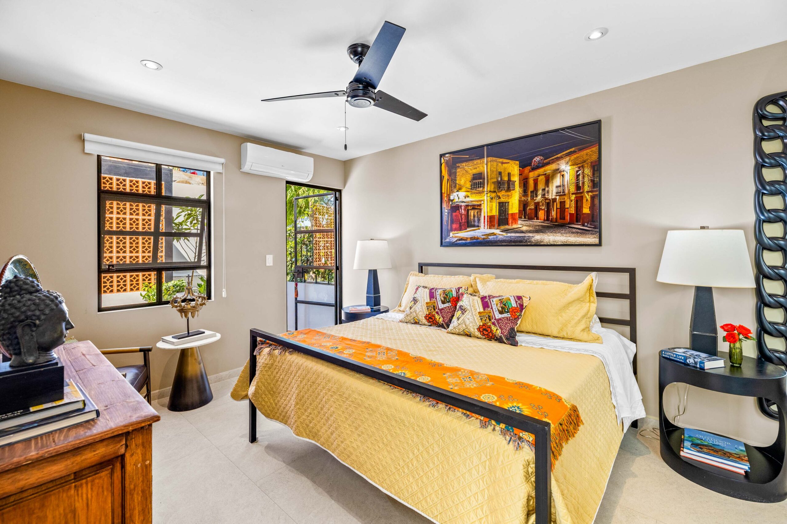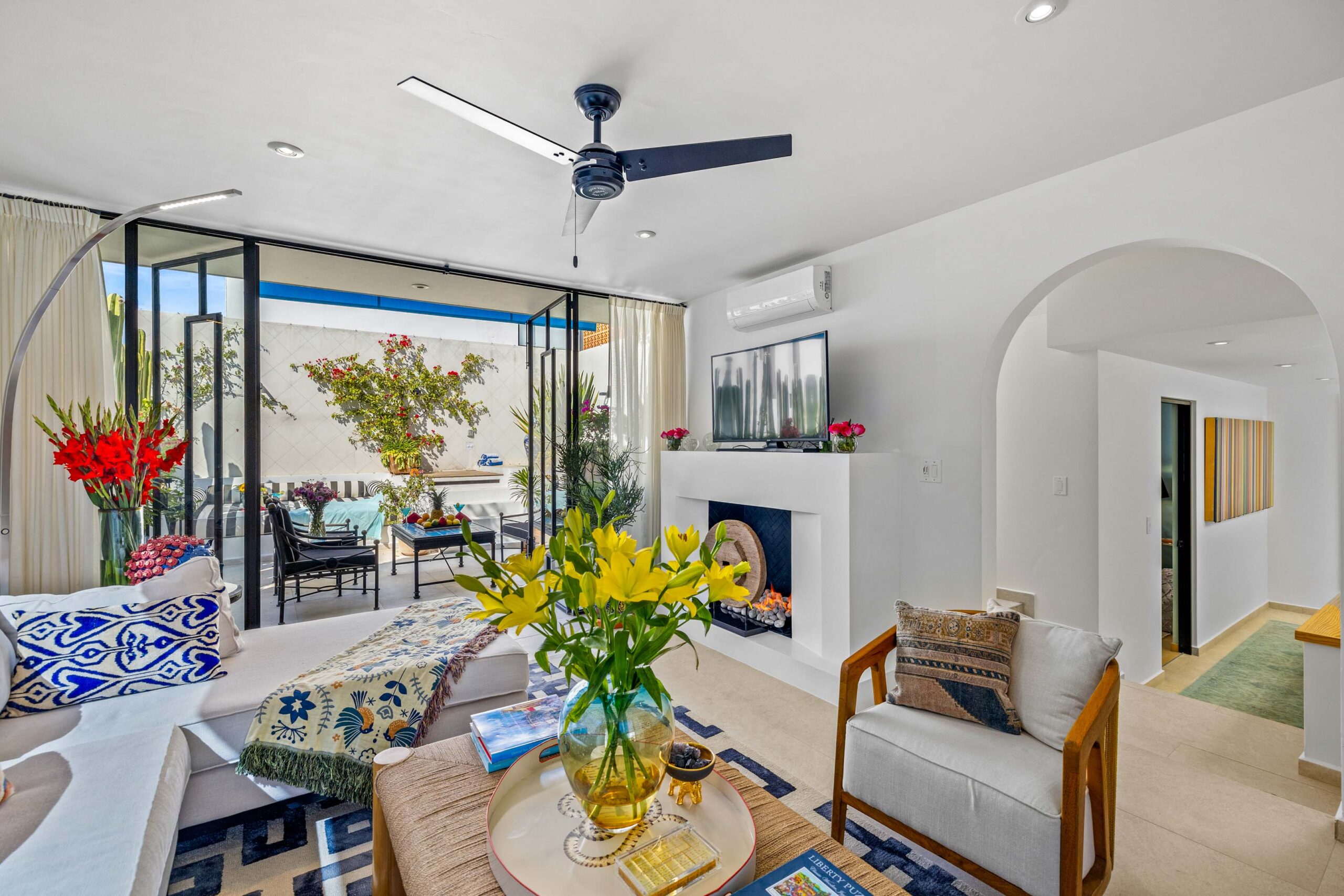 This corner home with ideal south & east windows offers one-level living with a ground floor primary master suite, and the open-plan great room proves highly desirable with American clients. The master suite—replete with four-poster king-sized bed, two sets of closets, fireplace and terrace access—boasts a stunning marble-clad master bathroom with sitting area, oversized soaking tub, massive shower, and dual sinks, all naturally lit via windows opening to the courtyard. The 2nd floor offers a guest suite and amazing fireplace-anchored media/flex room opening through double French doors to the private spa terrace with hot tub, oversized resort-style chaise lounge, and cocktail sitting area. The 3rd floor guest suite offers a small coffee terrace and the roof terrace kitchen—wet bar, fridge and grill—hosts sunset dinner parties for six. Inclusive of underground gated parking and dual-entrance intercom gated security for the community, this home offers all the expected technical amenities including mini-splits in every room, water filtration system and two-story weeping-wall courtyard.