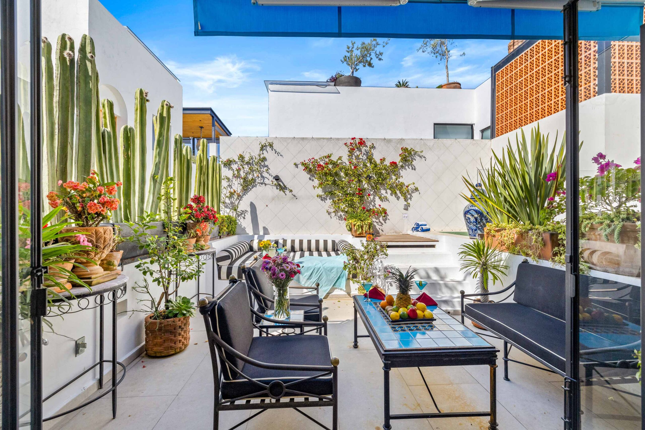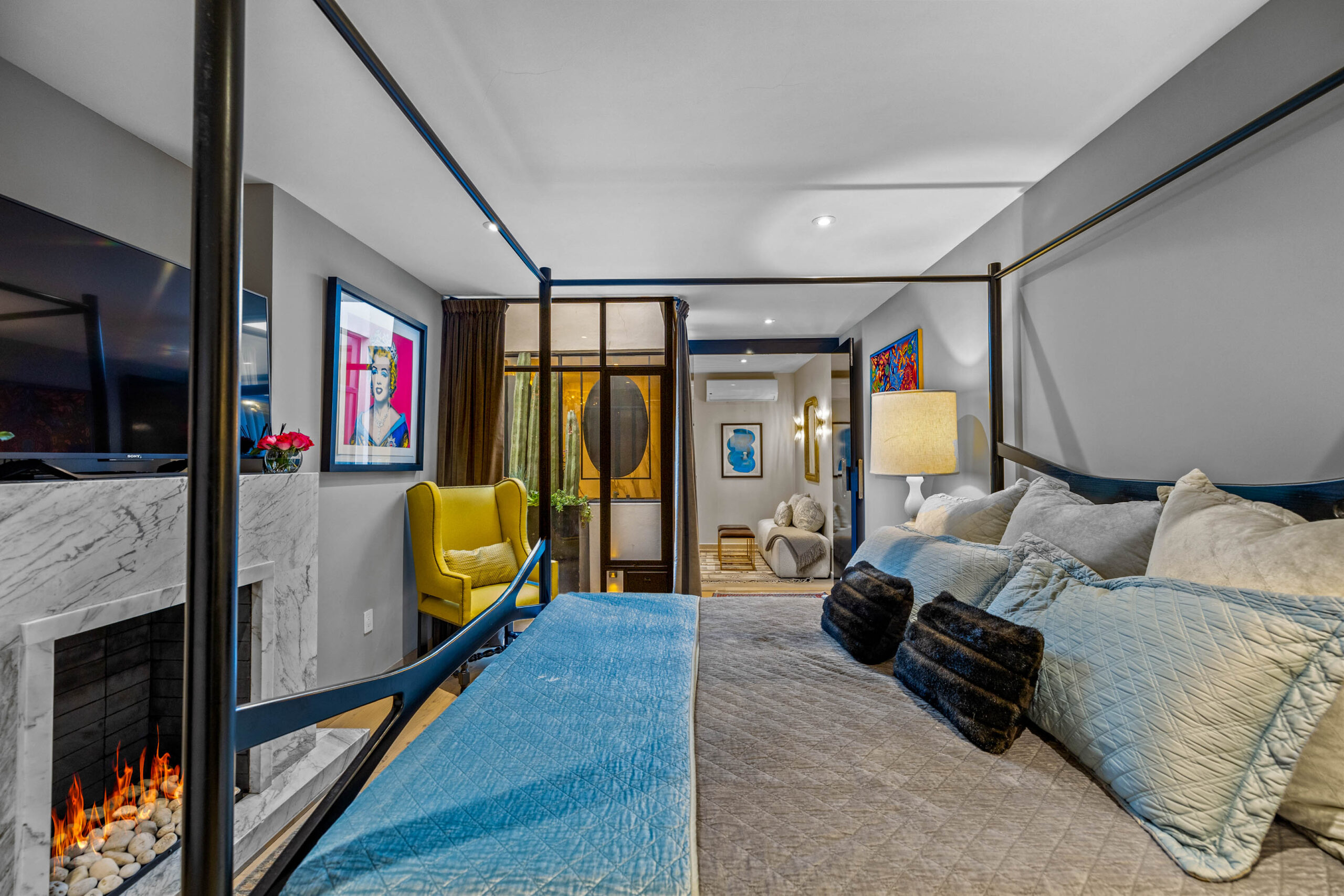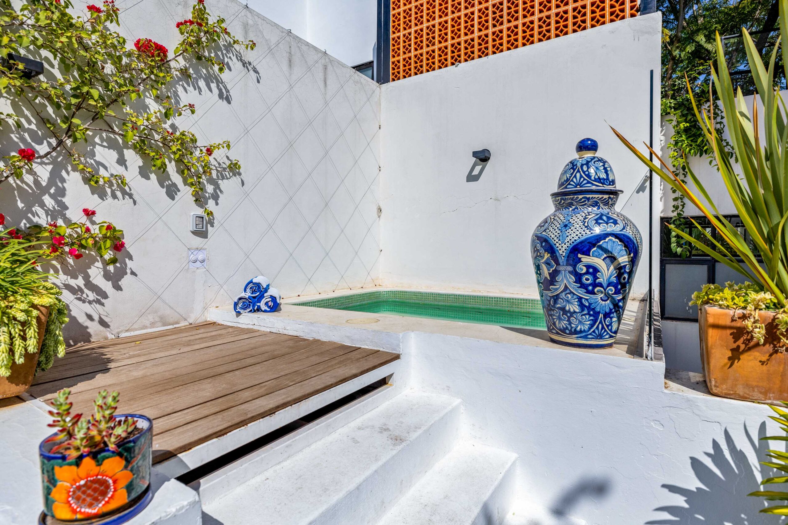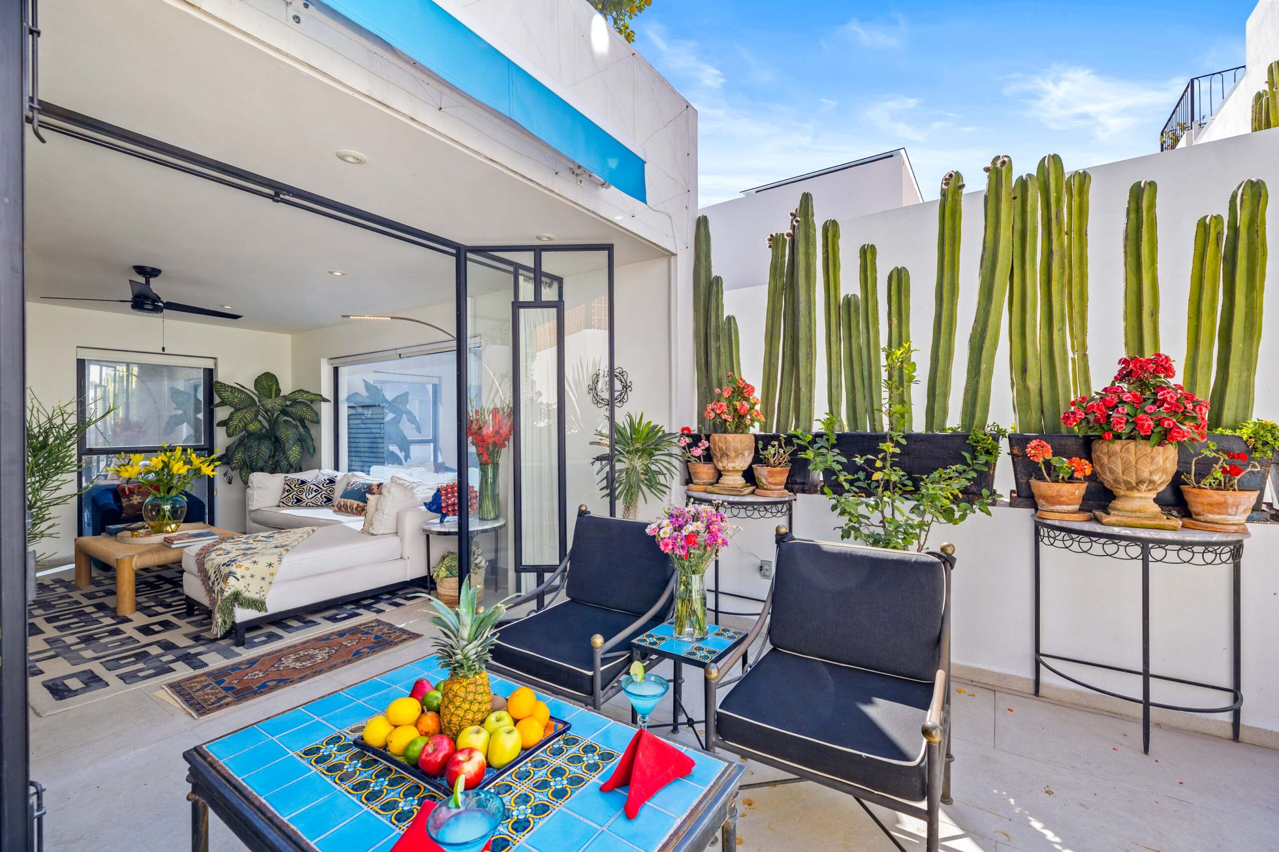 This corner home with ideal south & east windows offers one-level living with a ground floor primary master suite, and the open-plan great room proves highly desirable with American clients. The master suite—replete with four-poster king-sized bed, two sets of closets, fireplace and terrace access—boasts a stunning marble-clad master bathroom with sitting area, oversized soaking tub, massive shower, and dual sinks, all naturally lit via windows opening to the courtyard. The 2nd floor offers a guest suite and amazing fireplace-anchored media/flex room opening through double French doors to the private spa terrace with hot tub, oversized resort-style chaise lounge, and cocktail sitting area. The 3rd floor guest suite offers a small coffee terrace and the roof terrace kitchen—wet bar, fridge and grill—hosts sunset dinner parties for six. Inclusive of underground gated parking and dual-entrance intercom gated security for the community, this home offers all the expected technical amenities including mini-splits in every room, water filtration system and two-story weeping-wall courtyard.