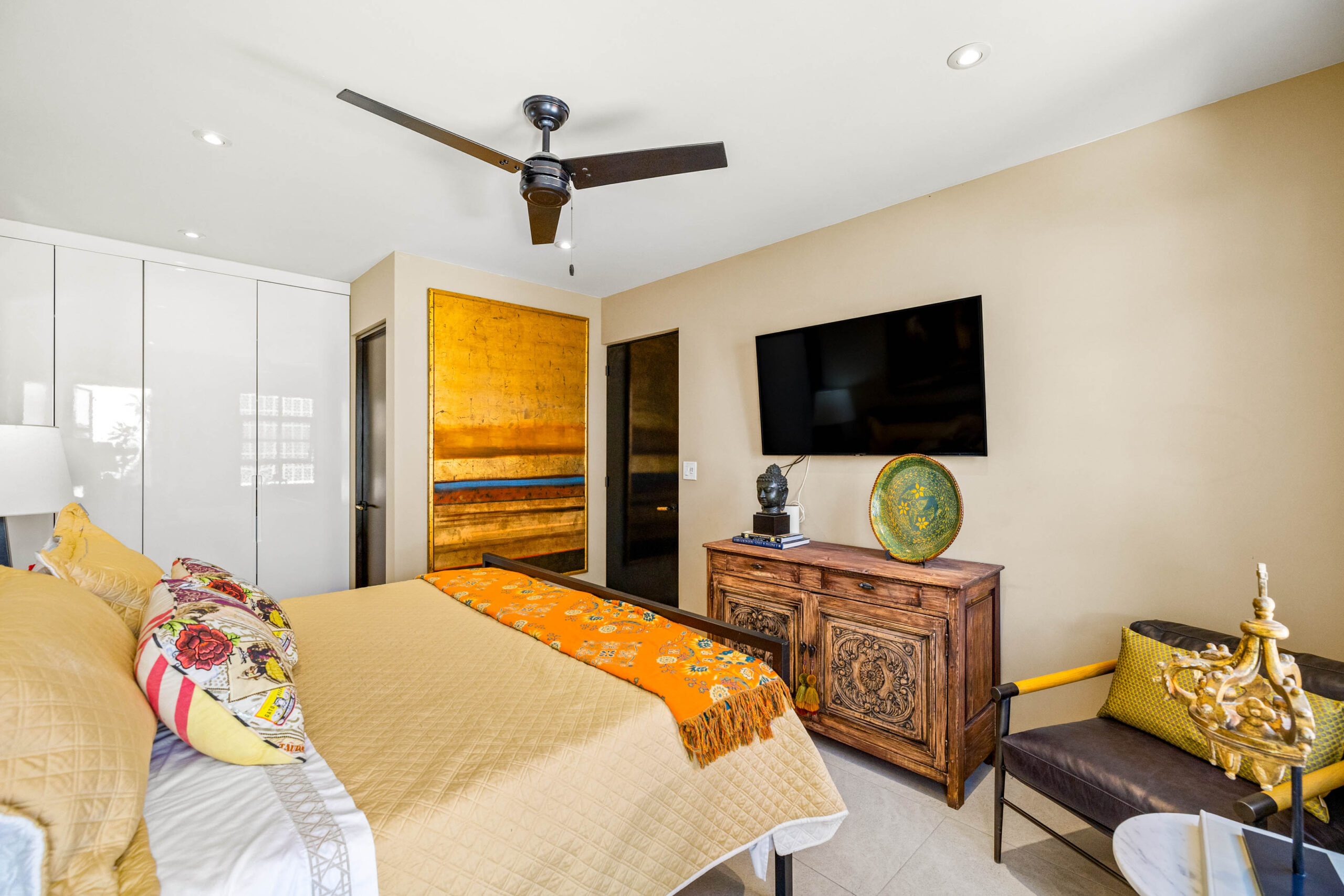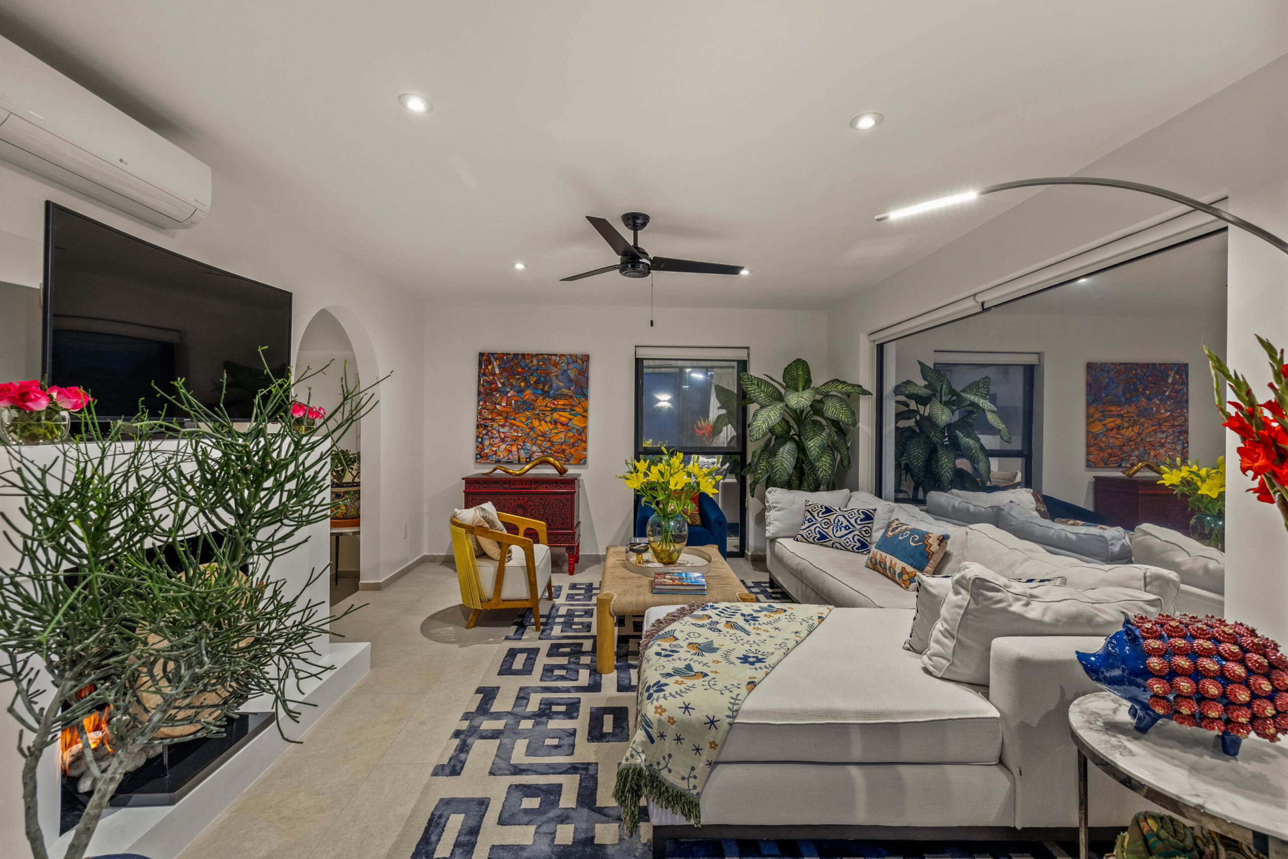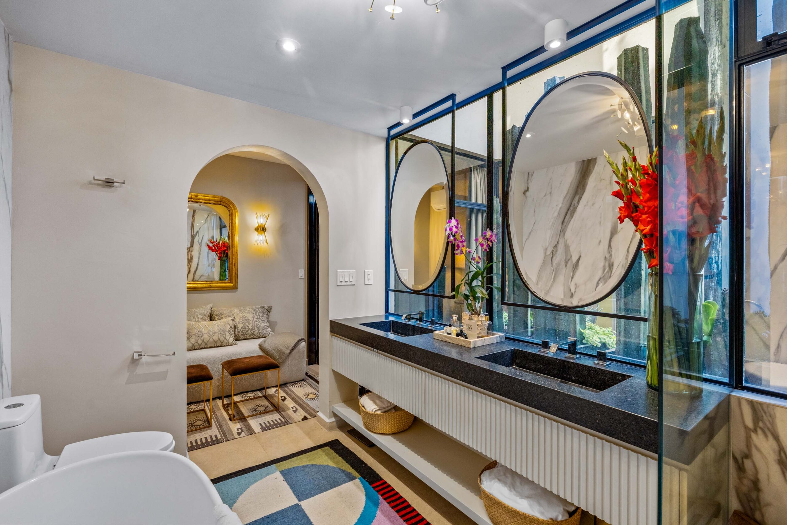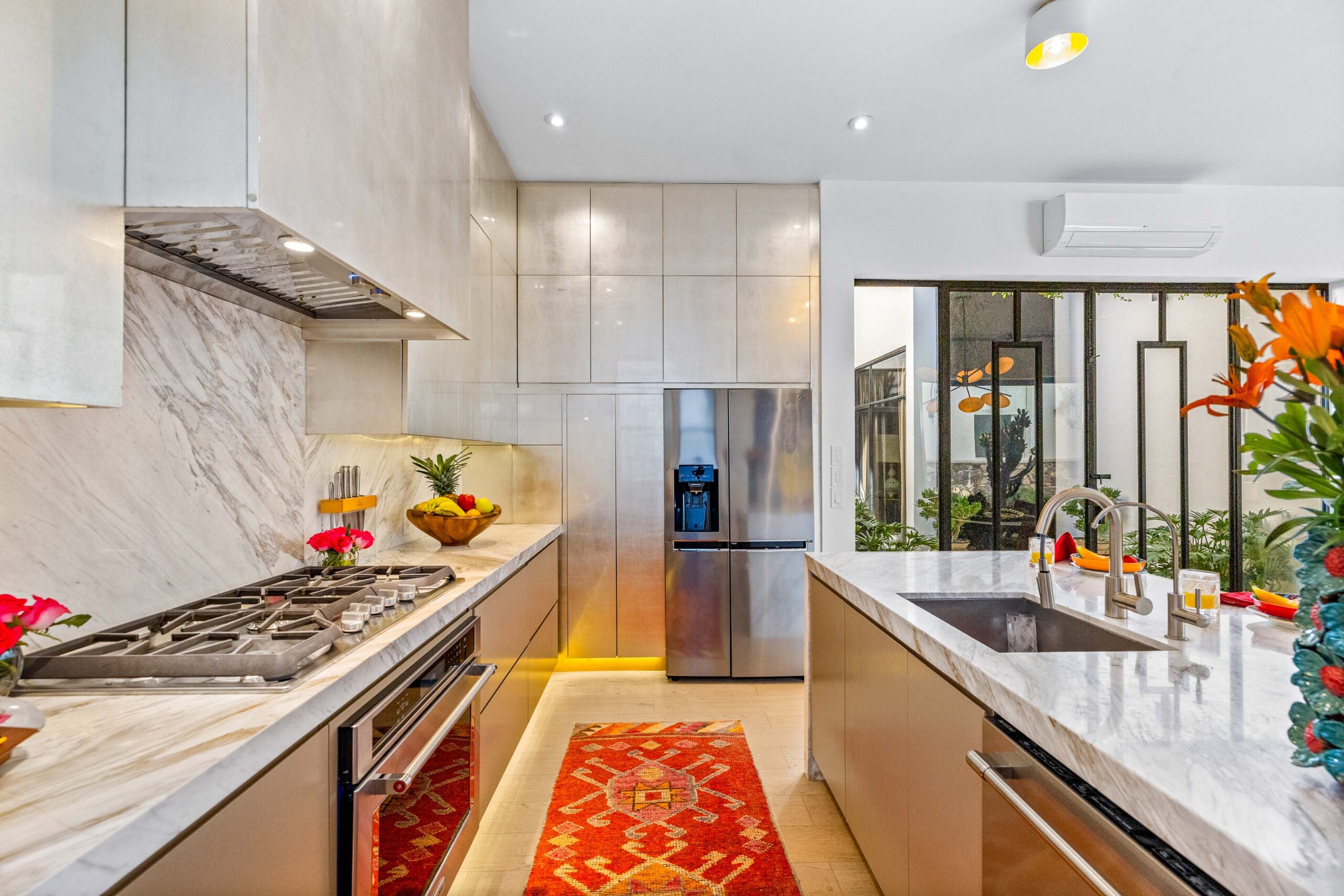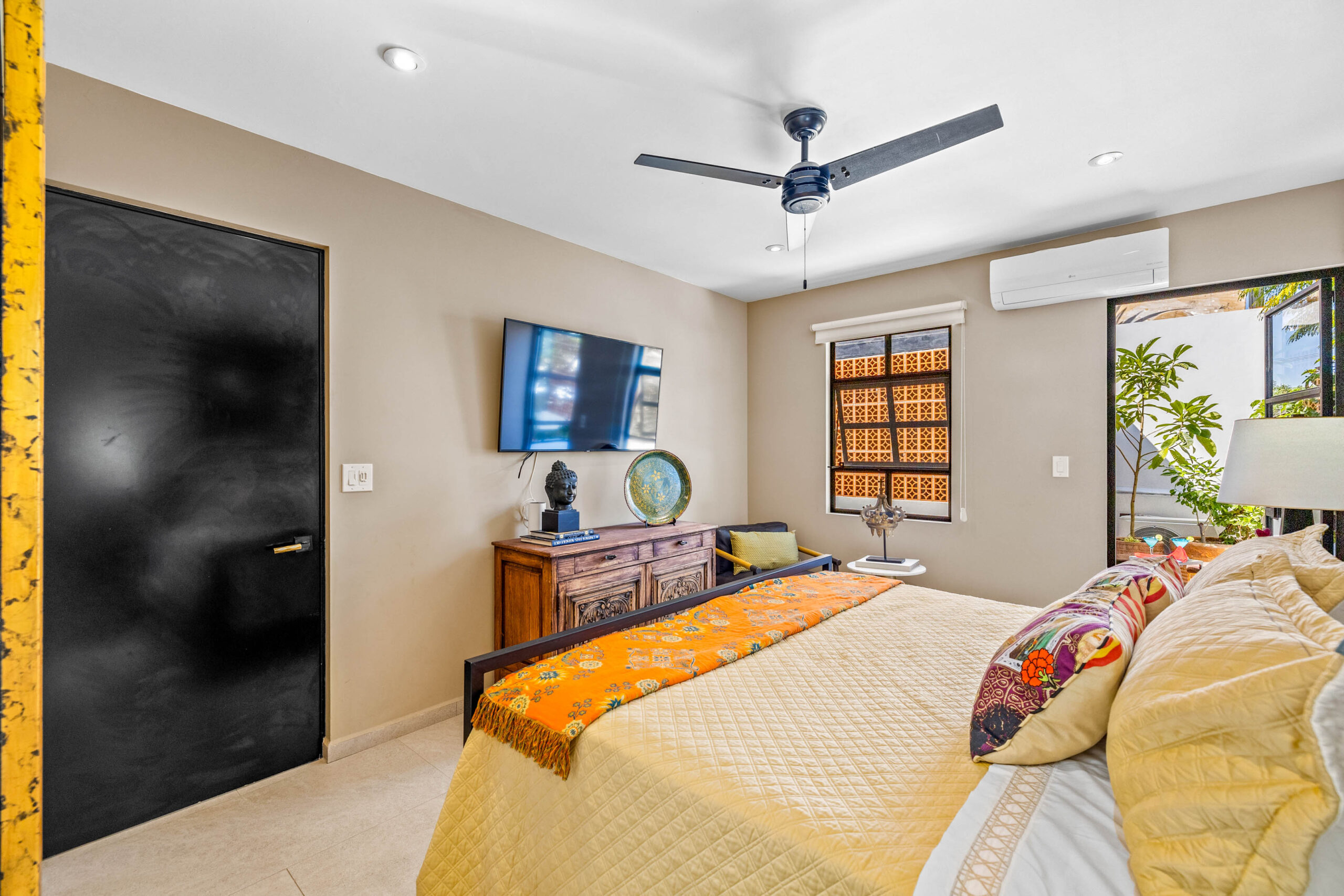 This corner home with ideal south & east windows offers one-level living with a ground floor primary master suite, and the open-plan great room proves highly desirable with American clients. The master suite—replete with four-poster king-sized bed, two sets of closets, fireplace and terrace access—boasts a stunning marble-clad master bathroom with sitting area, oversized soaking tub, massive shower, and dual sinks, all naturally lit via windows opening to the courtyard. The 2nd floor offers a guest suite and amazing fireplace-anchored media/flex room opening through double French doors to the private spa terrace with hot tub, oversized resort-style chaise lounge, and cocktail sitting area. The 3rd floor guest suite offers a small coffee terrace and the roof terrace kitchen—wet bar, fridge and grill—hosts sunset dinner parties for six. Inclusive of underground gated parking and dual-entrance intercom gated security for the community, this home offers all the expected technical amenities including mini-splits in every room, water filtration system and two-story weeping-wall courtyard.