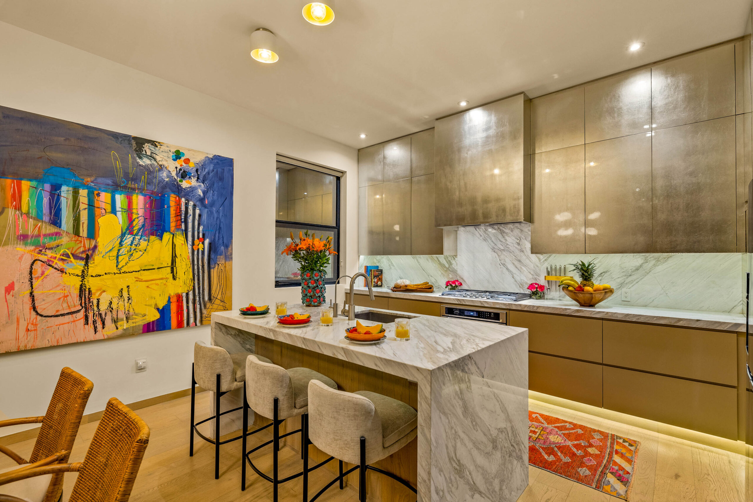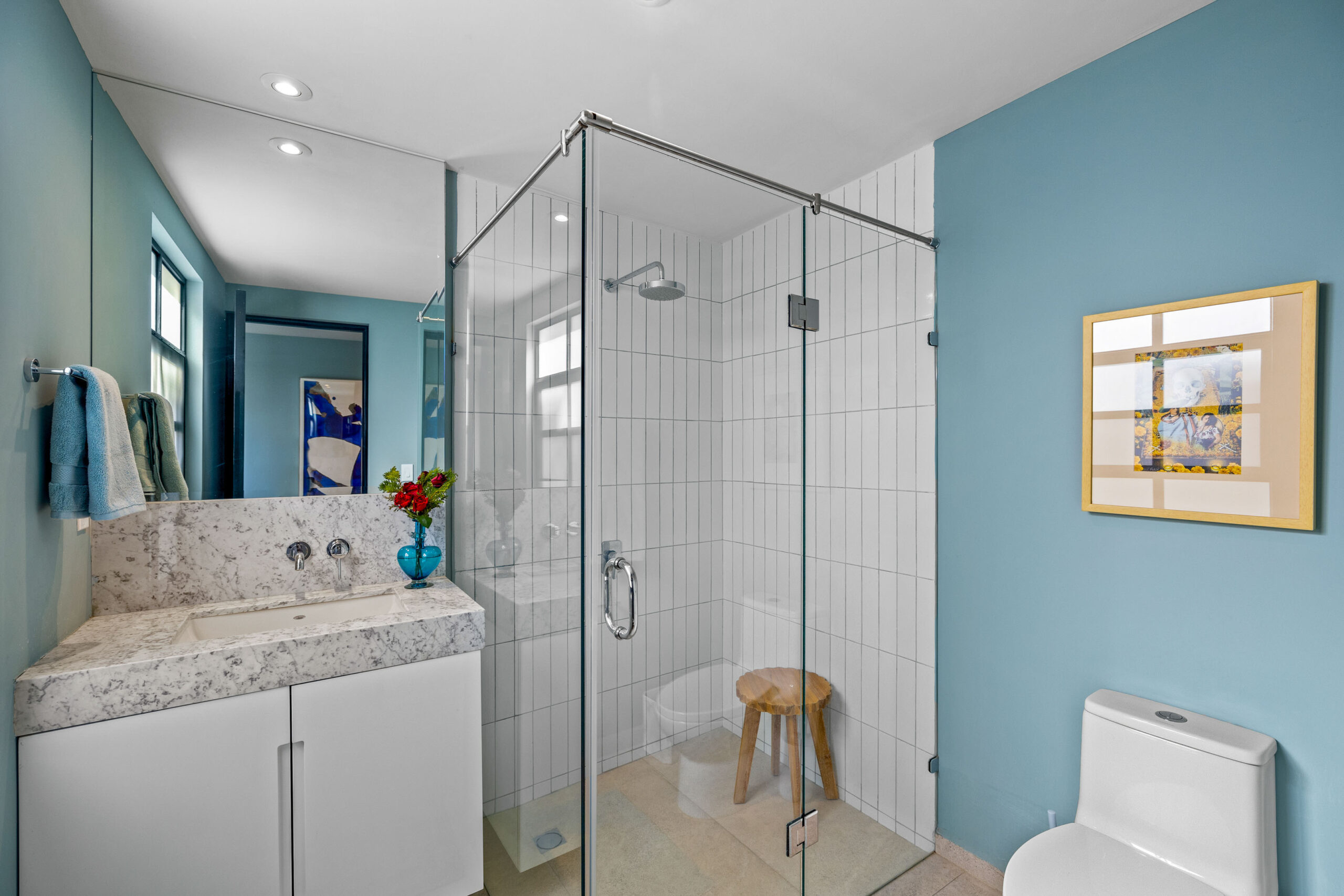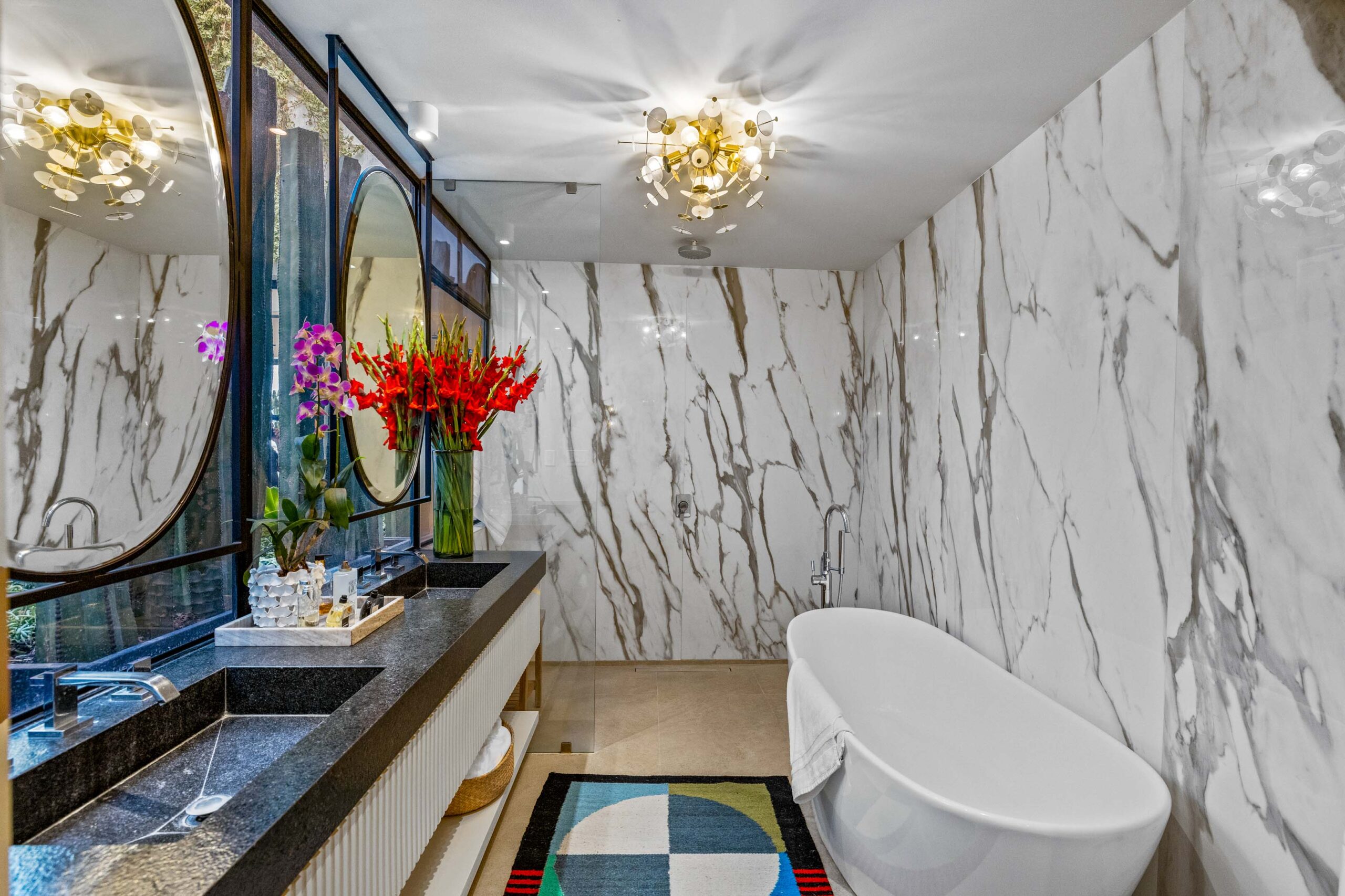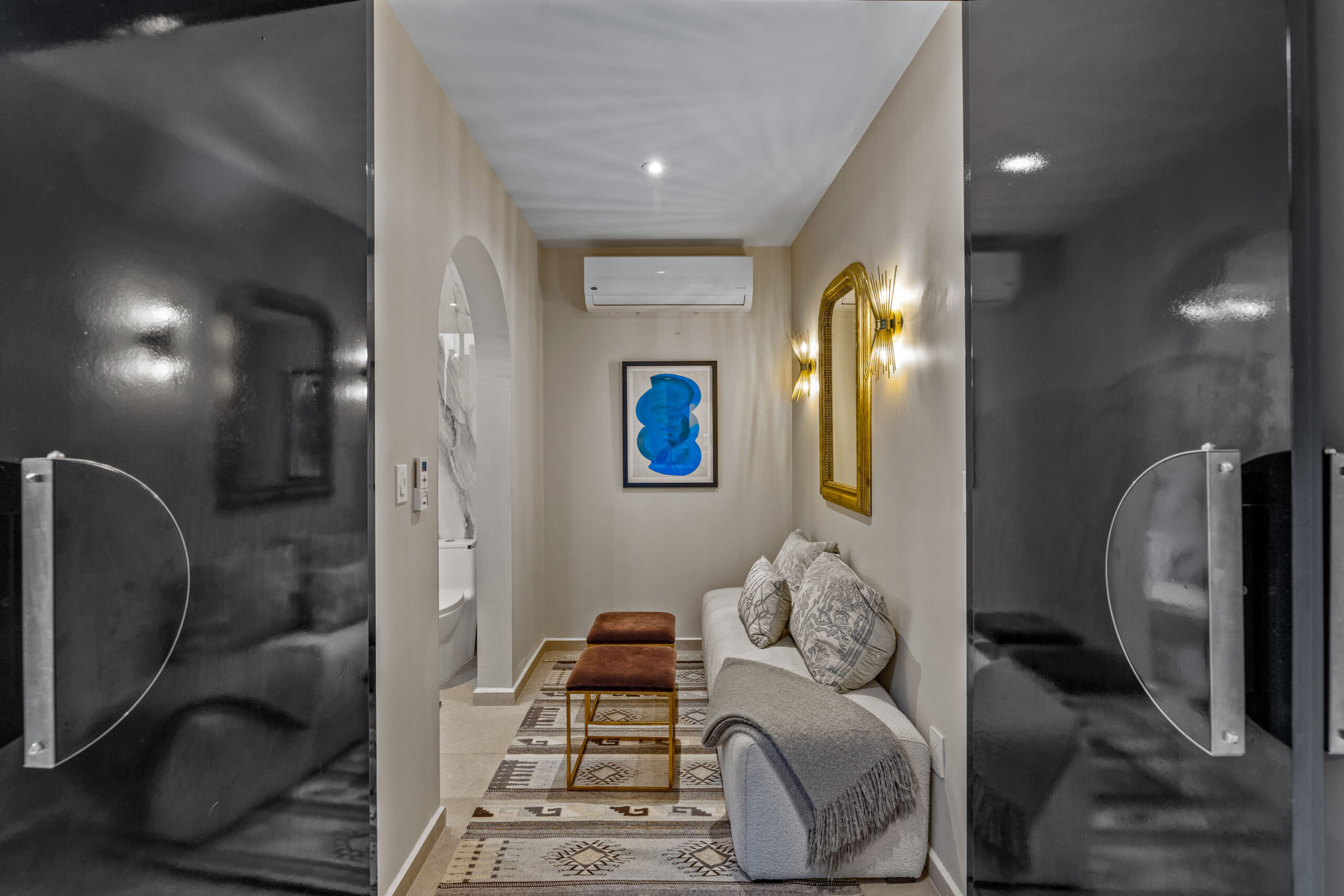 This corner home with ideal south & east windows offers one-level living with a ground floor primary master suite, and the open-plan great room proves highly desirable with American clients. The master suite—replete with four-poster king-sized bed, two sets of closets, fireplace and terrace access—boasts a stunning marble-clad master bathroom with sitting area, oversized soaking tub, massive shower, and dual sinks, all naturally lit via windows opening to the courtyard. The 2nd floor offers a guest suite and amazing fireplace-anchored media/flex room opening through double French doors to the private spa terrace with hot tub, oversized resort-style chaise lounge, and cocktail sitting area. The 3rd floor guest suite offers a small coffee terrace and the roof terrace kitchen—wet bar, fridge and grill—hosts sunset dinner parties for six. Inclusive of underground gated parking and dual-entrance intercom gated security for the community, this home offers all the expected technical amenities including mini-splits in every room, water filtration system and two-story weeping-wall courtyard.
